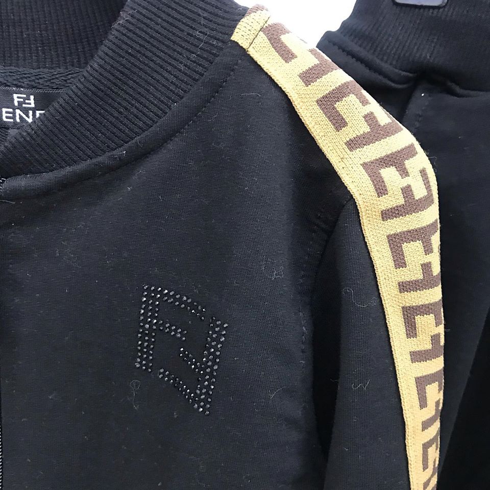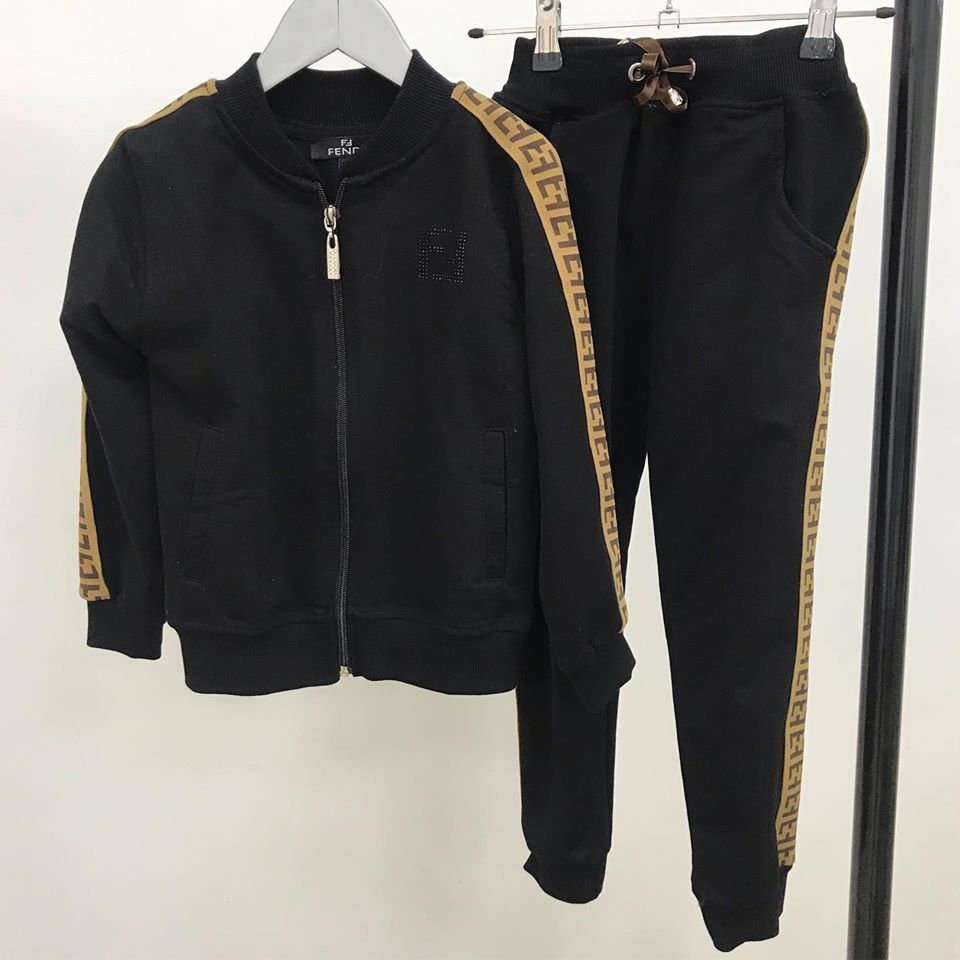 Костюм спортивный Fendi LUX-28155 выполнен в классическом спортивном стиле. Комплект из черного цвета с контрастными золотистыми вставками с узнаваемым логотипом бренда по бокам. Костюм идеально подойдет для занятий спортом, прогулок или создания стильных повседневных образов.