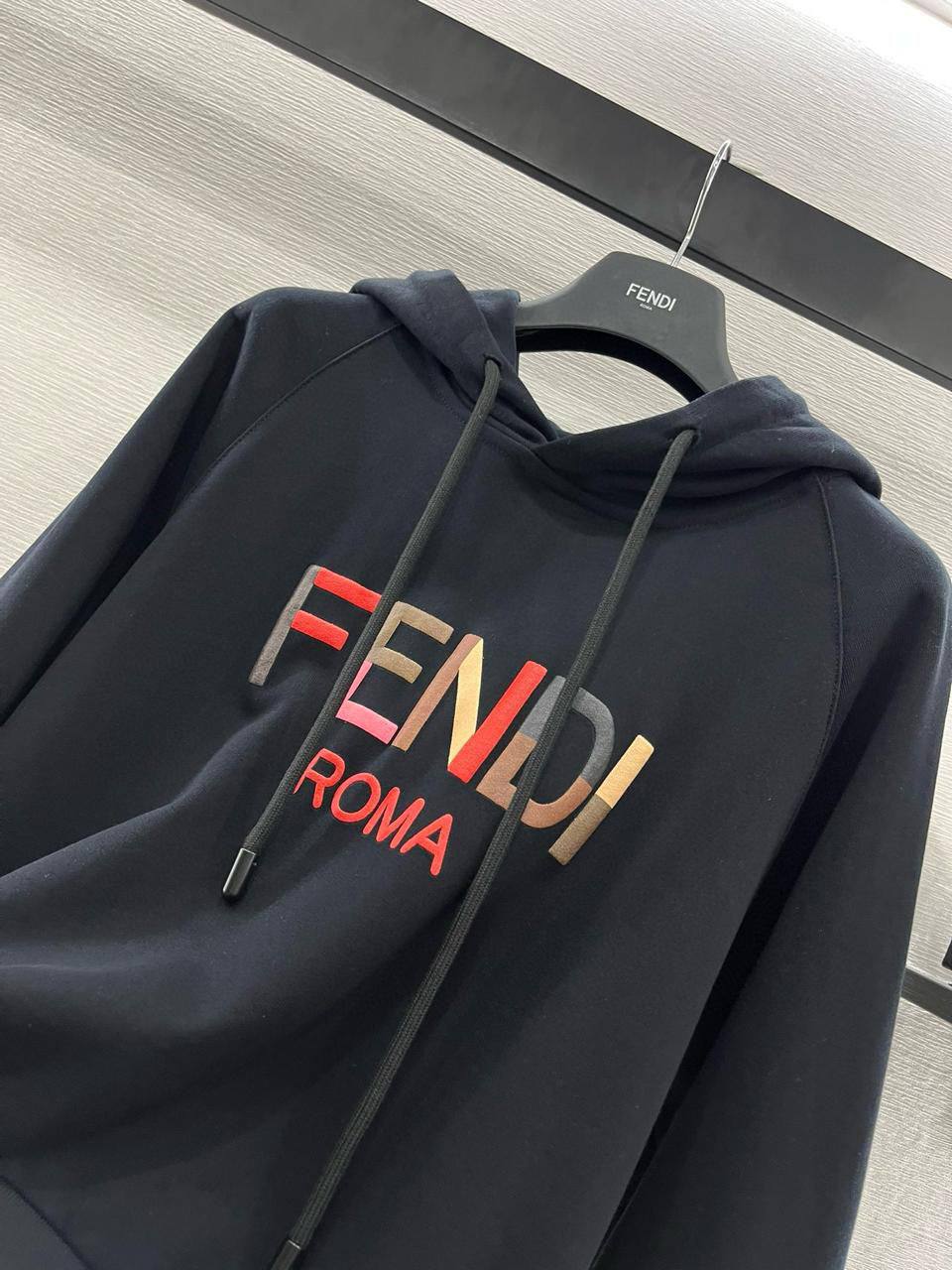 Костюм спортивный Fendi LUX-111329 — это стильный худи темно-синего цвета с капюшоном. Худи украшено крупным логотипом Fendi Roma в разноцветных тонах, создавая яркий акцент. Этот предмет гардероба подходит для создания как спортивных, так и повседневных образов.