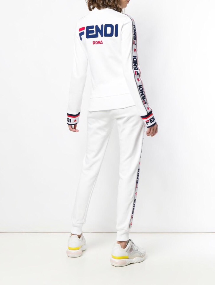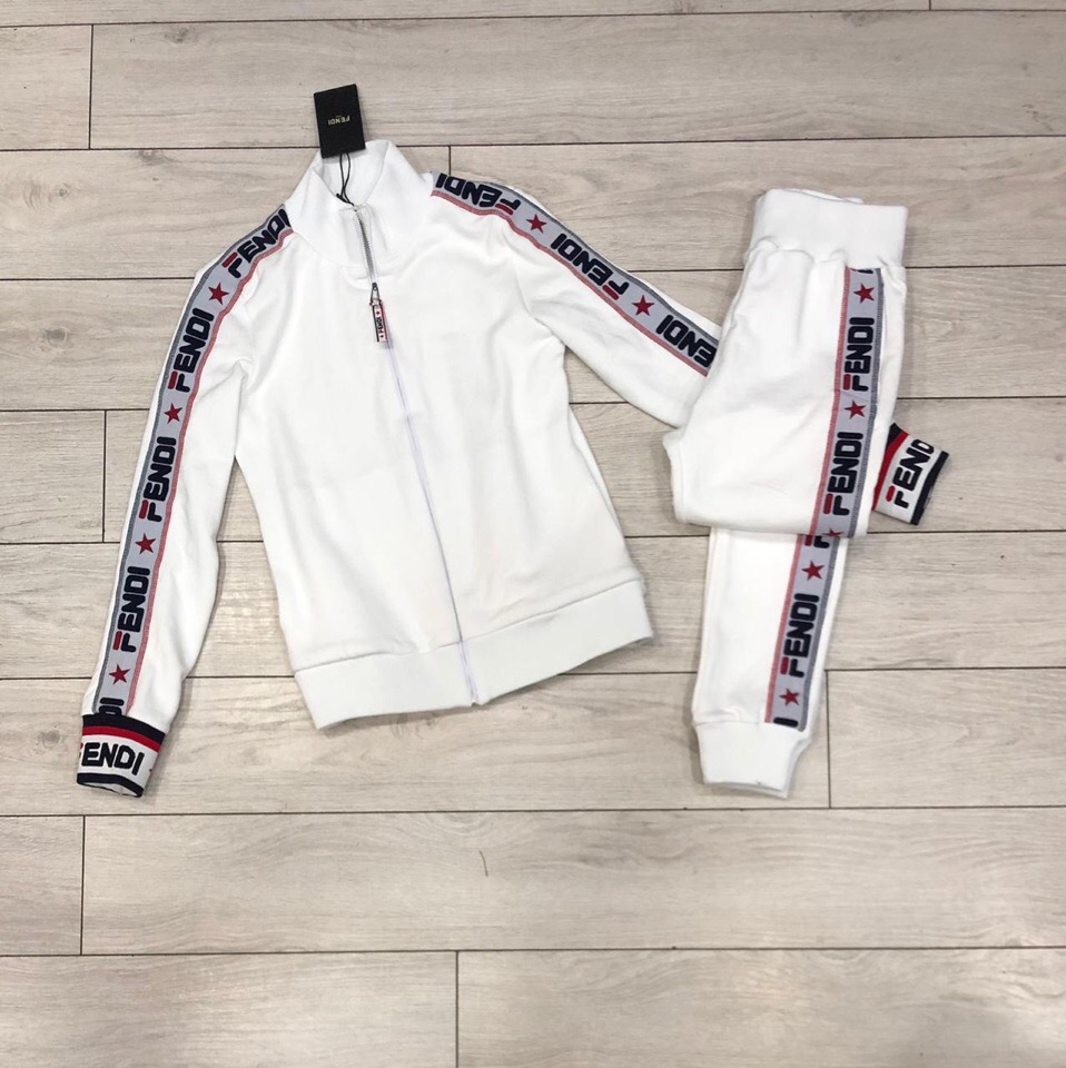 Спортивный костюм женский Fendi ОДЖ-1194 – это стильный и комфортный комплект, идеально подходящий для активного образа жизни. Белый цвет костюма дополнен контрастными синими и красными деталями, включая крупный логотип "FENDI ROMA" на спине и фирменную ленту с названием бренда по бокам брюк и на рукавах. Этот костюм сочетает в себе элементы спортивной одежды и модные тенденции, делая его универсальным выбором.