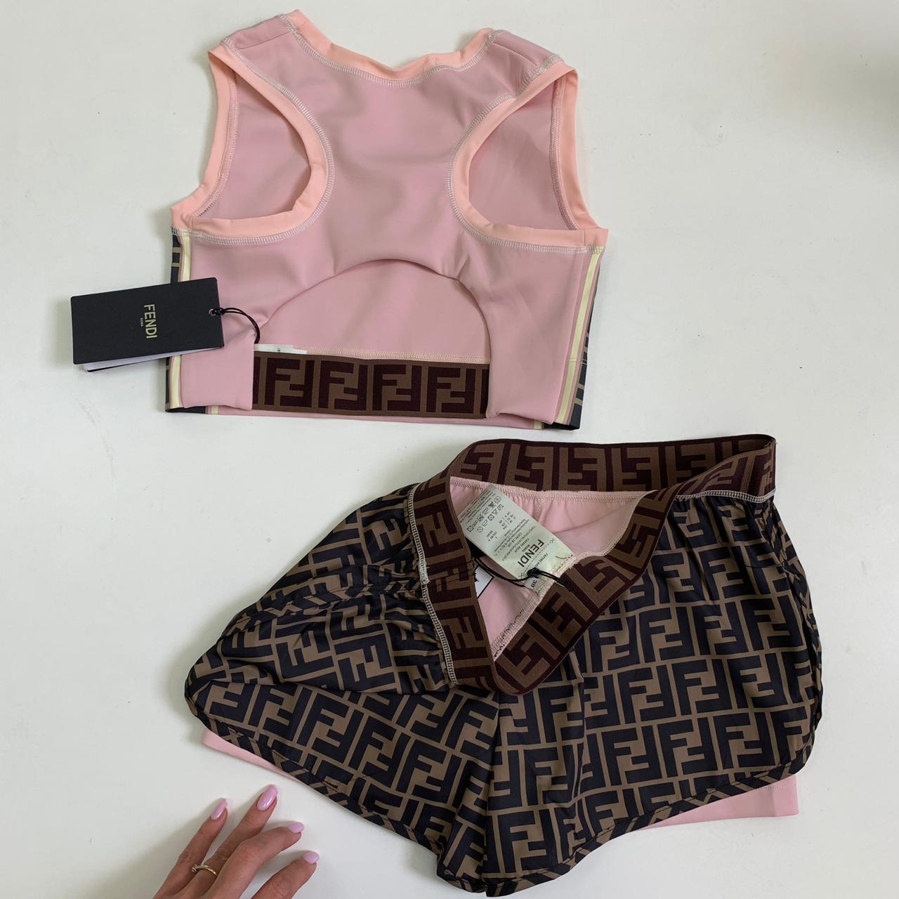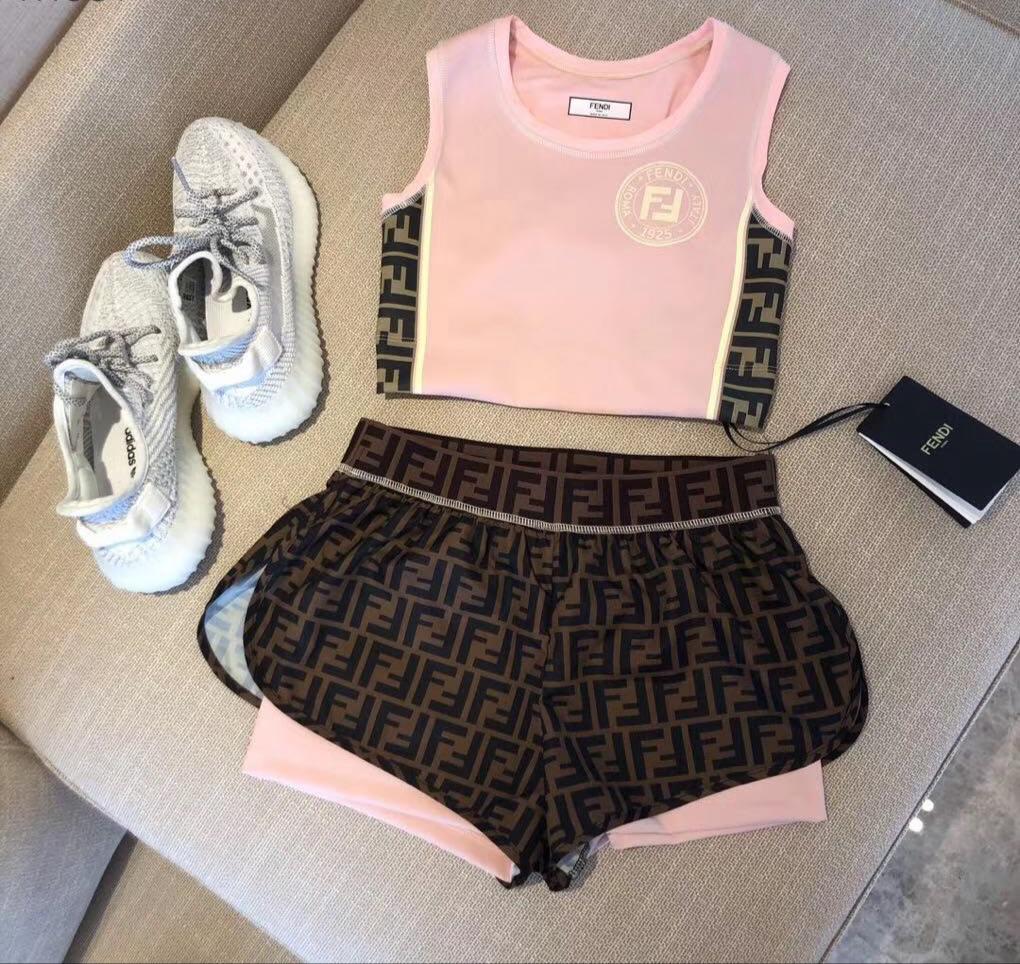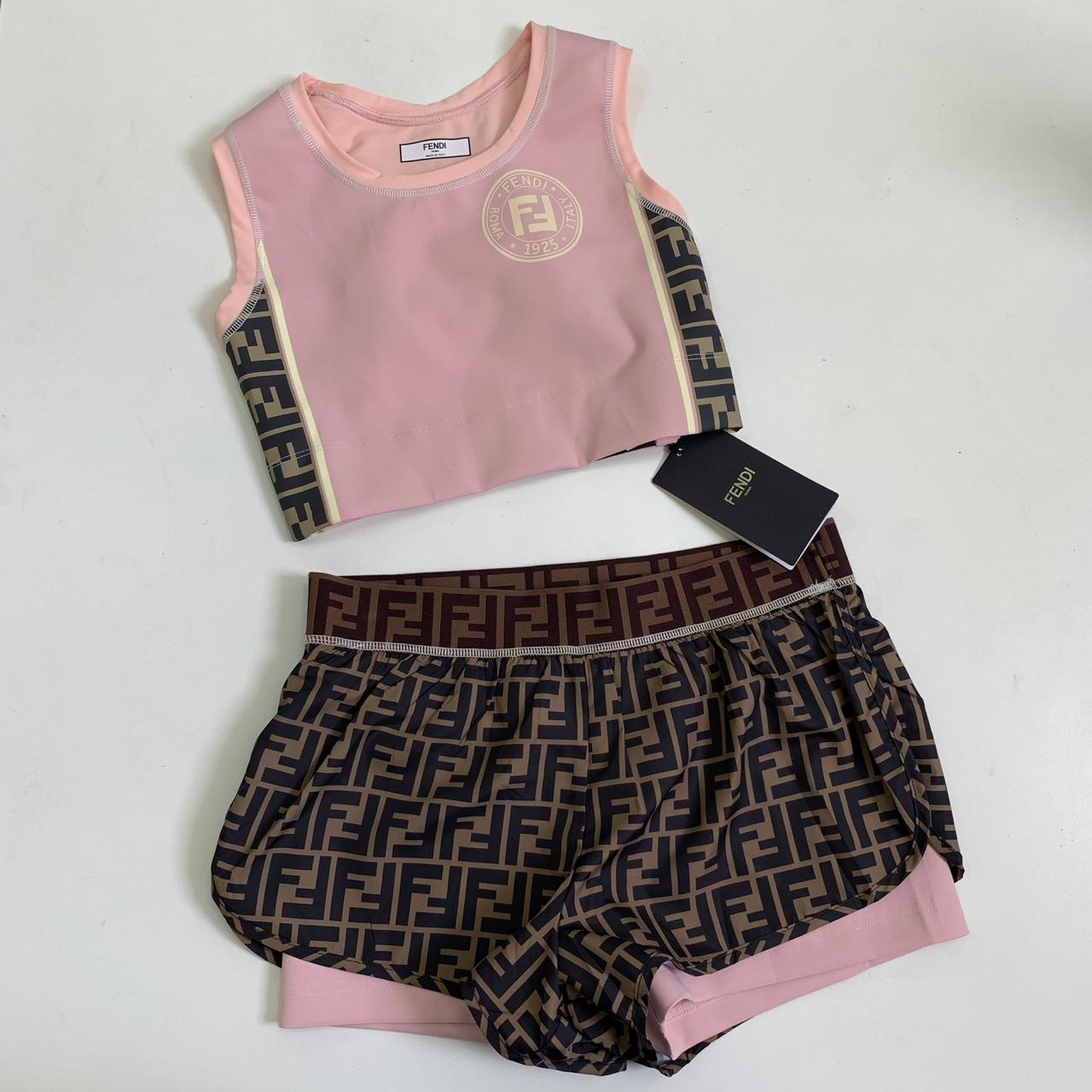 Стильный женский костюм Fendi LUX-12622, состоящий из короткого топа и шорт, выполнен в характерном для бренда дизайне. Этот комплект идеально подходит для активного образа жизни, сочетая в себе модный внешний вид и функциональность.