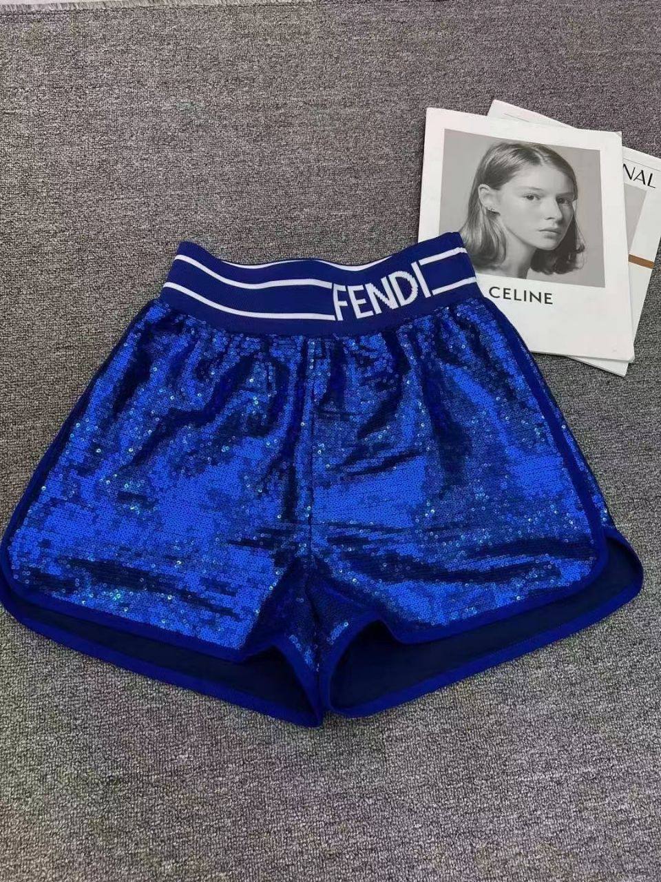 Костюм женский Fendi LUX-85038, представленный на фото, – это стильный и современный комплект, состоящий из футболки и шорт. Белая футболка с ярким логотипом Fendi и синие шорты, украшенные блестками, создают эффектный контраст. Этот костюм идеально подойдет для тех, кто ценит комфорт и модный дизайн.