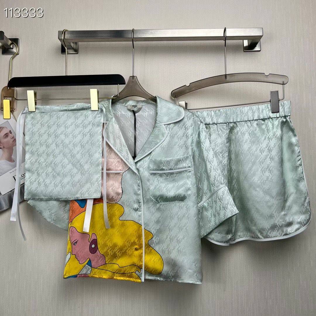 Костюм женский Fendi LUX-67647 представляет собой комплект из шелковистой пижамы, выполненной в нежном мятном оттенке. Дизайн включает характерный монограммный узор Fendi по всей поверхности ткани и яркий принт с изображением женского лица на футболке. Этот комплект сочетает в себе комфорт домашней одежды с элегантностью итальянского бренда.