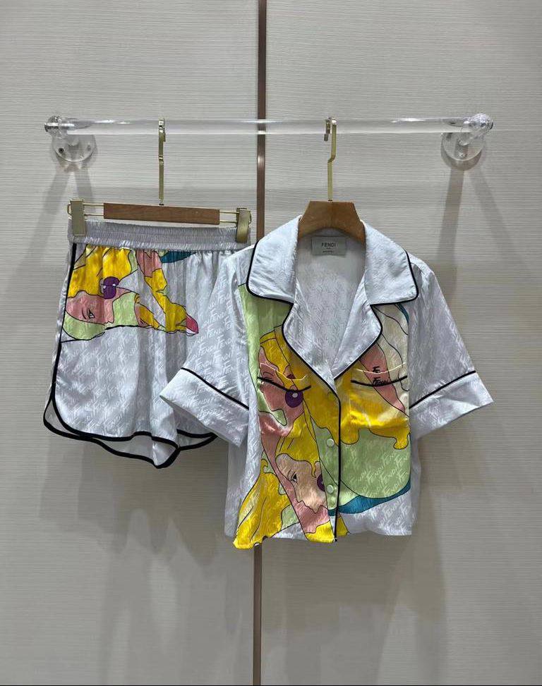 Костюм женский Fendi LUX-68294 – это стильный и комфортный домашний комплект, сочетающий в себе элегантность бренда Fendi и яркий, запоминающийся принт. Комплект состоит из рубашки с коротким рукавом и шорт, выполненных в едином дизайне. Этот набор станет идеальным выбором для тех, кто ценит комфорт и модный образ даже в домашней обстановке.