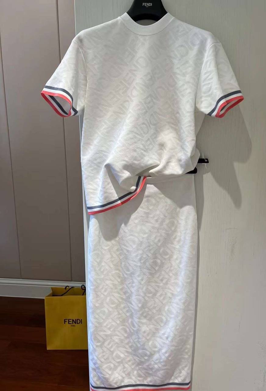 Костюм женский Fendi LUX-94233 — это стильный комплект, который состоит из футболки с короткими рукавами и юбки. Комплект выполнен в белом цвете с текстурой, напоминающей логотип бренда. Дизайн костюма сочетает в себе спортивный и элегантный стиль, что делает его подходящим для повседневной носки и особых случаев.