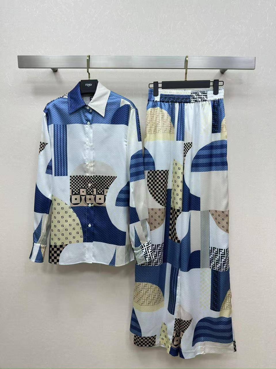 Костюм женский Fendi LUX-120158 - это стильный и элегантный костюм, представляющий собой верхнюю рубашку с длинными рукавами и широкие брюки. Дизайн костюма отличается уникальным паттерном, сочетающим различные геометрические фигуры и элементы, что придает ему современный и привлекательный вид.