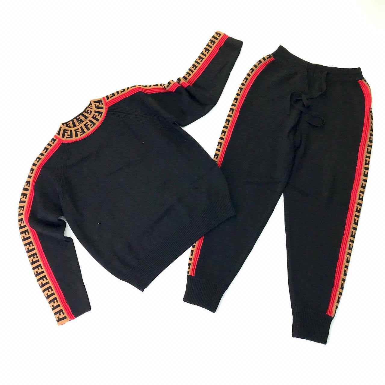 Представленный костюм женский Fendi LUX-42216 сочетает в себе спортивный стиль и элементы роскоши, характерные для бренда Fendi. Комплект состоит из джемпера и брюк, выполненных в классическом черном цвете, дополненных фирменным принтом Fendi и контрастной красной полосой по бокам. Этот костюм идеально подойдет для создания современных и стильных образов как для повседневной носки, так и для активного отдыха, подчеркивая индивидуальность и чувство стиля своей обладательницы.