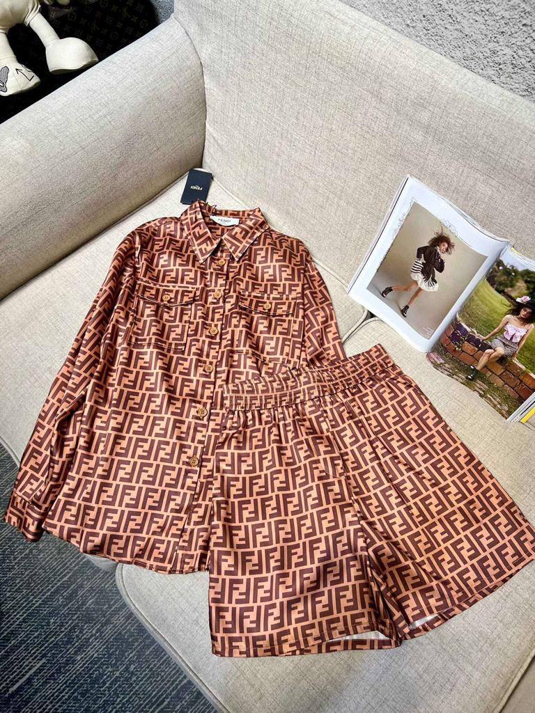 Костюм женский Fendi LUX-89713 представляет собой комплект, состоящий из рубашки с длинными рукавами и шорт. Дизайн костюма выполнен в коричнево-оранжевых тонах с повторяющимся логотипом бренда. Комплект отличается элегантным стилем и подходит для различных повседневных ситуаций.