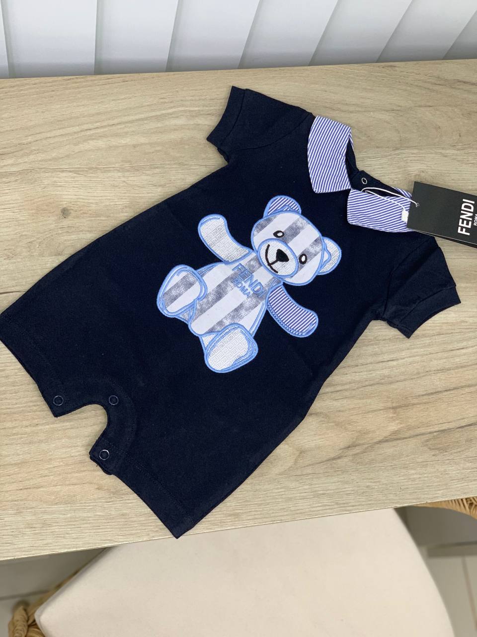 Песочник Fendi LUX-67390 - это очаровательный предмет детской одежды, выполненный в темно-синем цвете. Он украшен аппликацией в виде милого медвежонка с полосатыми элементами, перекликающимися с отделкой воротника. Этот песочник идеально подходит для самых маленьких, сочетая в себе узнаваемый стиль Fendi и практичность для повседневного ношения.