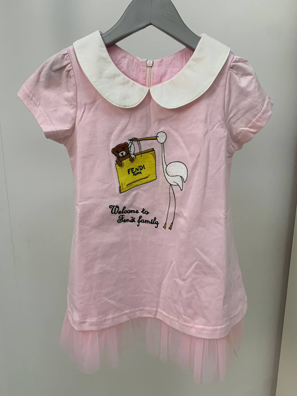 Это очаровательное розовое платье Fendi LUX-66202 для девочек выполнено в игривом стиле. Оно украшено милым принтом с изображением медвежонка, несущего сумку Fendi, и аиста, что придает ему сказочный вид. Декоративная оборка по подолу добавляет платью легкости и воздушности, делая его идеальным выбором для летних прогулок и праздничных мероприятий.
