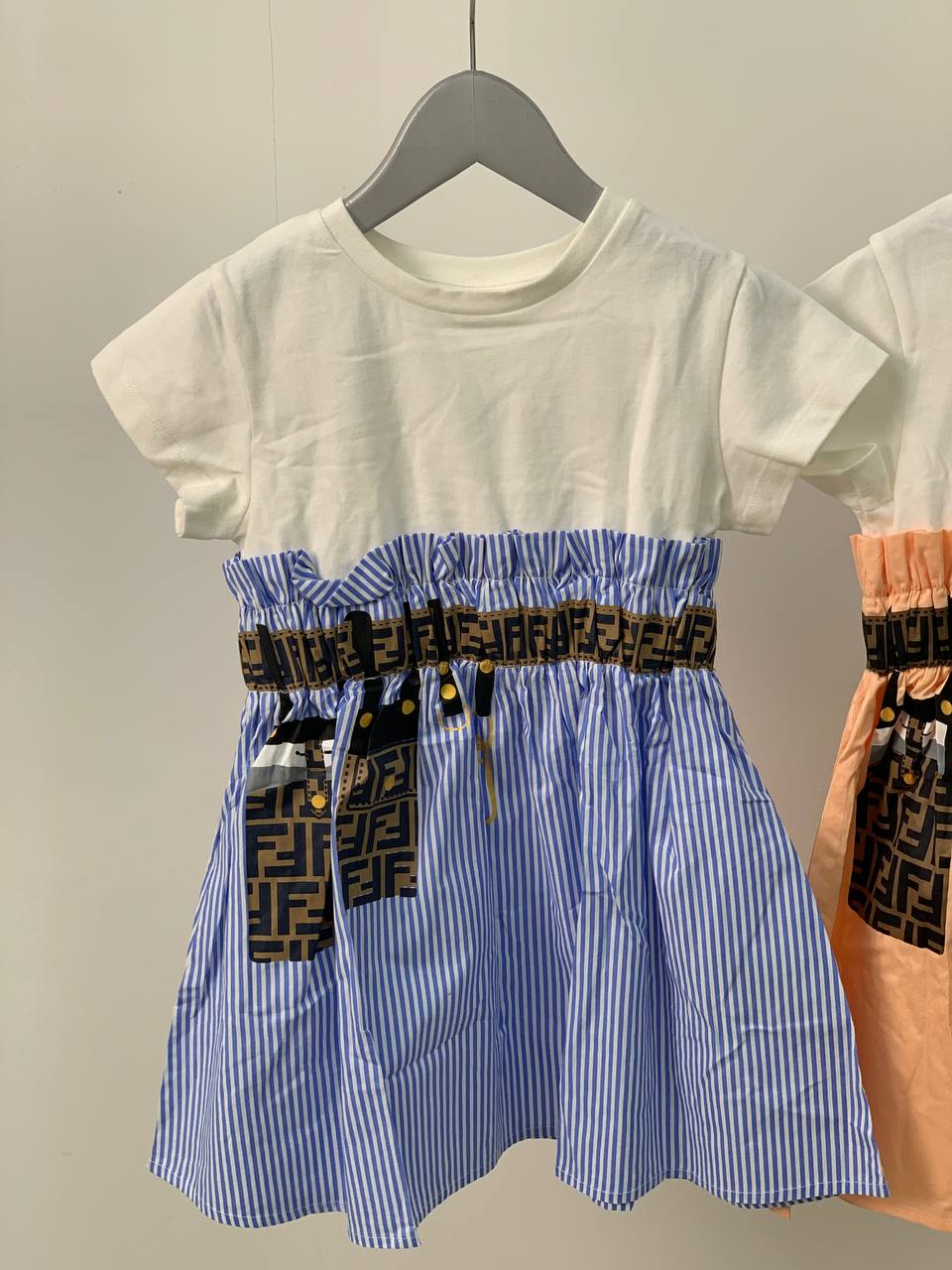 Это детское платье Fendi LUX-68069 идеально подходит для жаркой летней погоды, сочетая в себе комфорт и стильный дизайн. Верх платья выполнен в виде белой футболки с короткими рукавами, а юбка декорирована сине-белой полоской и украшена фирменным принтом Fendi. Эластичный пояс с кулиской обеспечивает идеальную посадку.