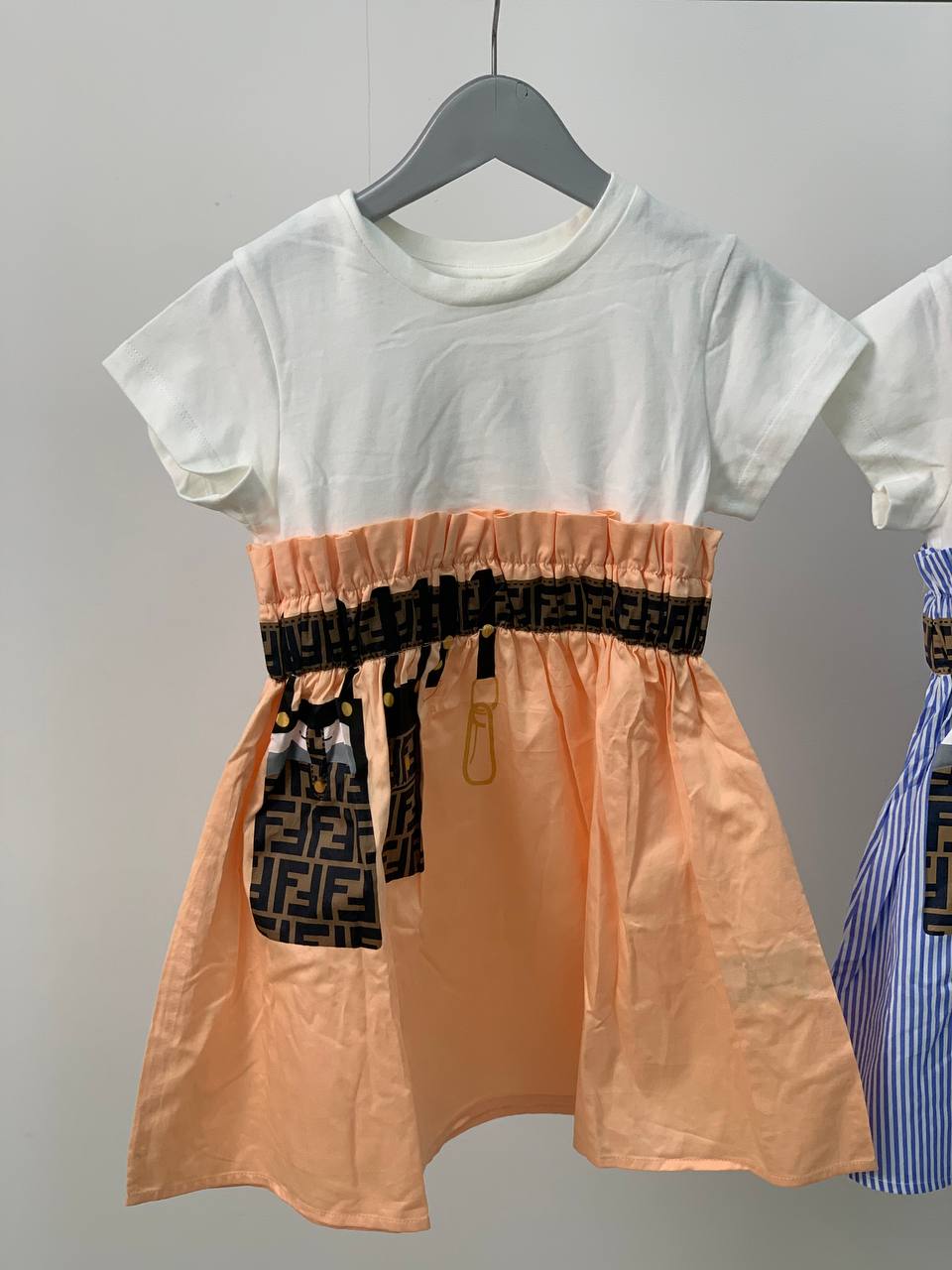 Платье Fendi LUX-68070 представляет собой элегантное решение для юных модниц, сочетающее в себе комфорт и узнаваемый стиль бренда. Белый верх из мягкой ткани дополнен яркой юбкой персикового оттенка, украшенной контрастной эластичной резинкой с логотипом Fendi. Оригинальные накладные карманы с характерным принтом FF добавляют платью игривости и узнаваемости.