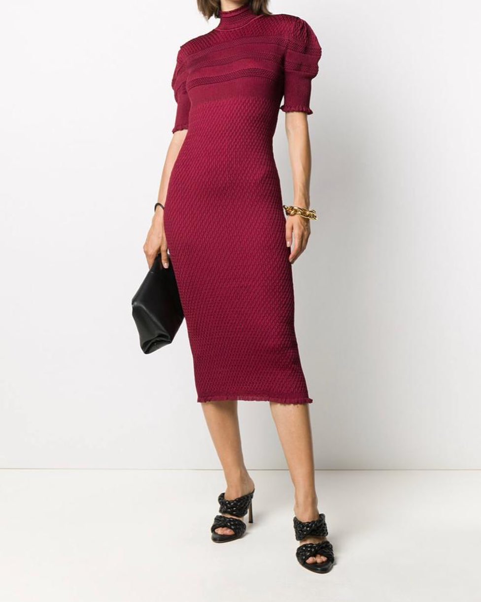 Это элегантное трикотажное платье Fendi LUX-40204 винного цвета — идеальный выбор для создания утонченного образа. Модель средней длины с короткими рукавами-фонариками и высоким воротником-стойкой подчеркивает достоинства фигуры. Рельефный узор ткани и контрастные горизонтальные полосы на груди придают платью особый шик.