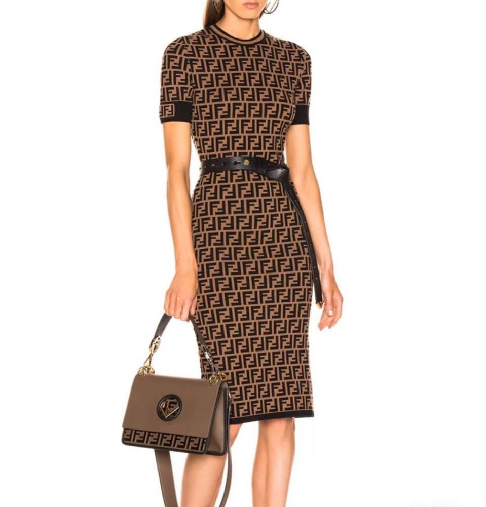 Платье Fendi Plate 40, представленное на изображении, — это элегантное платье-футляр с короткими рукавами и круглым вырезом, выполненное в фирменном стиле бренда. Основной цвет платья — сочетание коричневого и черного с узором логотипа бренда по всей поверхности. Это платье идеально подойдет для создания изысканного образа.
