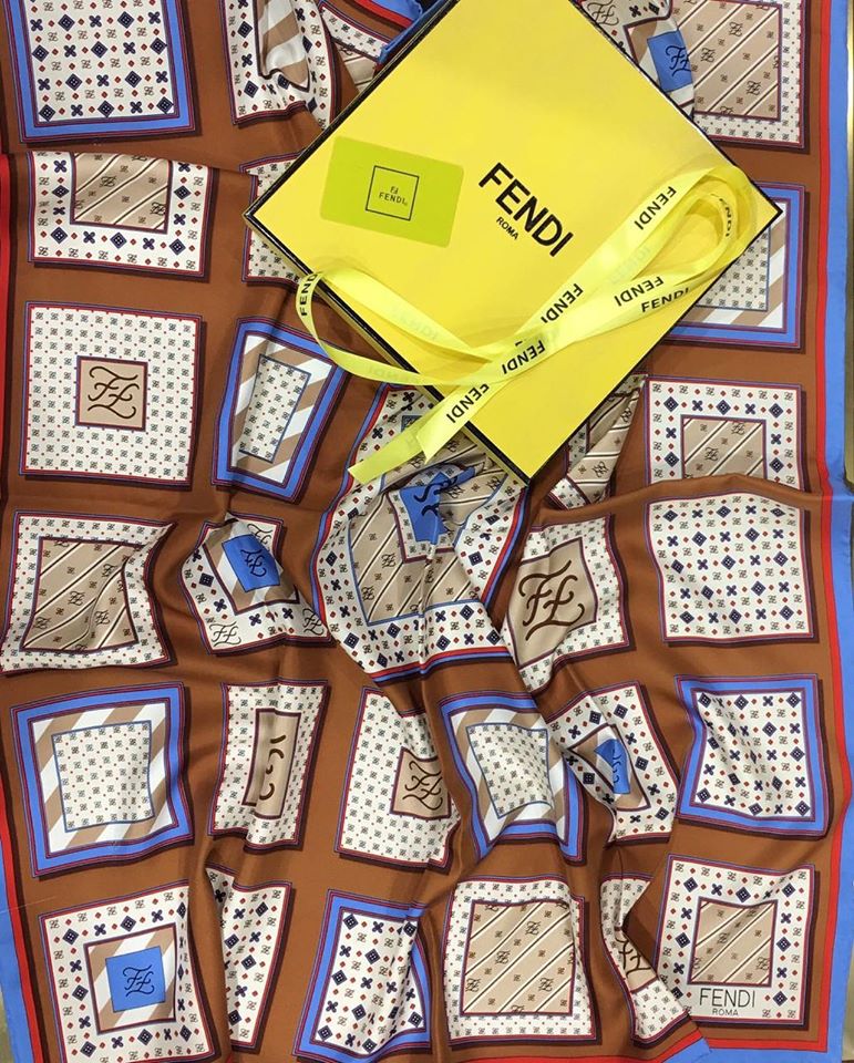 Представленный шелковый платок Fendi LUX-27143 демонстрирует изысканный дизайн, характерный для бренда Fendi. Этот аксессуар, выполненный в классическом квадратном формате, украшен разнообразными узорами, включая знаменитый логотип FF, геометрические орнаменты и полосатые мотивы, собранные в коллаж из квадратов. Богатая цветовая палитра с преобладанием коричневых, бежевых, синих и красных оттенков придает платку роскошный вид.