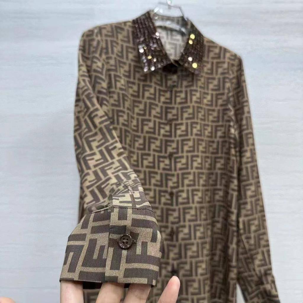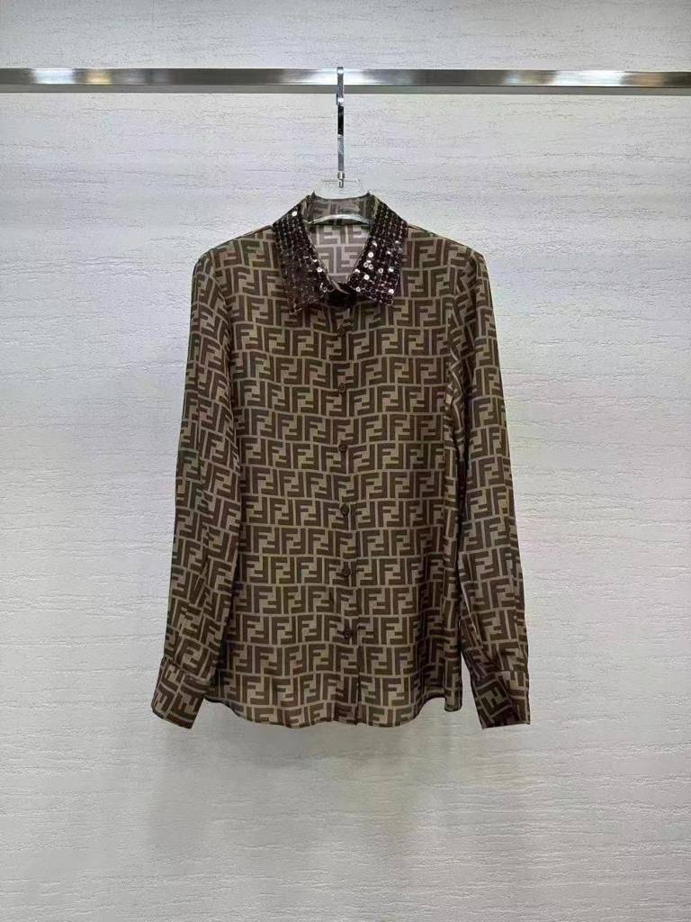 Рубашка Fendi LUX-101142 выполнена в фирменном стиле бренда с использованием узнаваемого логотипа. Рубашка имеет длинные рукава и классический воротник, украшенный пайетками. Она идеально подойдет для создания как повседневных, так и более формальных образов.