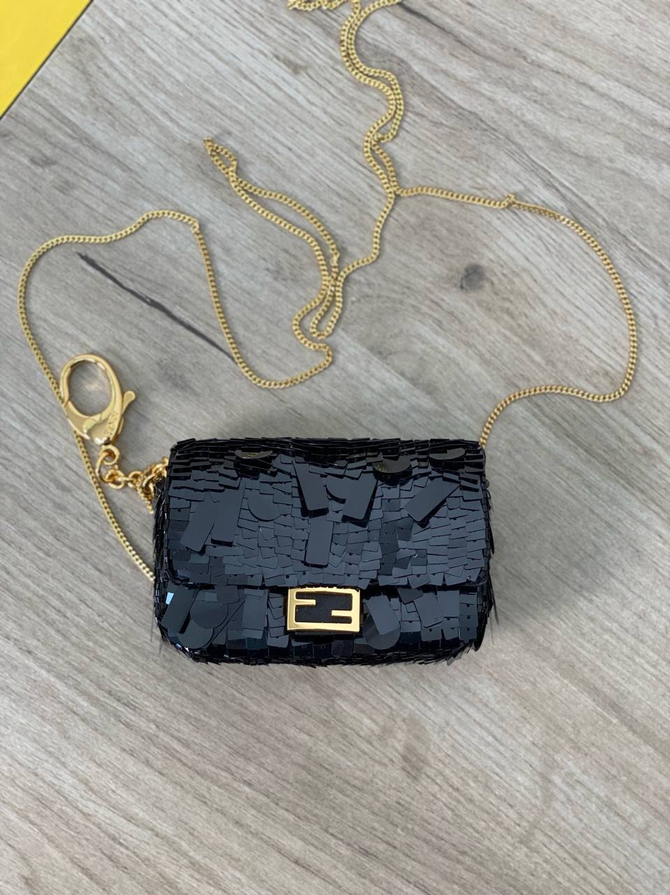 Элегантная женская сумка Fendi LUX-52892, выполненная в черном цвете, станет стильным дополнением к вашему образу. Этот миниатюрный аксессуар, украшенный переливающимися пайетками, идеально подходит для особых случаев и вечерних выходов, добавляя нотку гламура. Золотистая цепочка обеспечивает удобство ношения, позволяя использовать ее как сумочку через плечо.