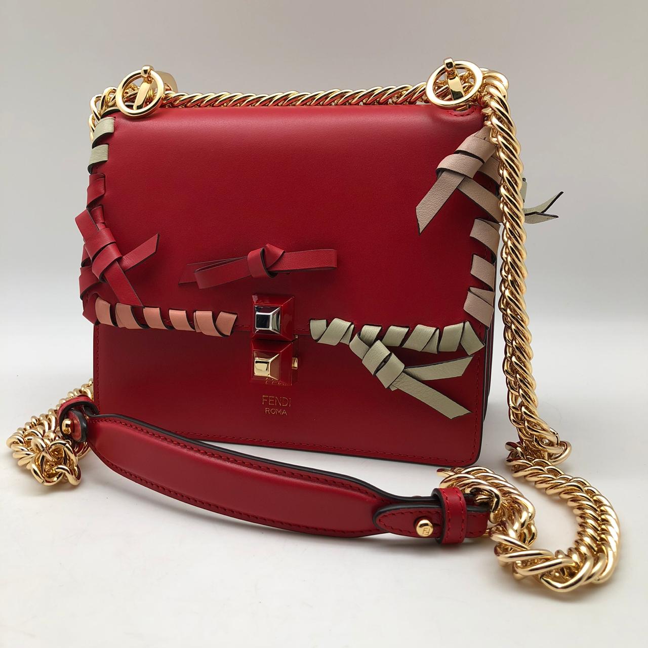 Эта женская сумка Fendi LUX-11757 выполнена в эффектном красном цвете, с изысканным декором из кожаных лент и золотистой фурнитуры. Оригинальный дизайн с плетеными элементами и бантиками придает сумке игривый и одновременно элегантный вид. Застежка с квадратными акцентами и логотип "FENDI ROMA" подчеркивают премиальный статус изделия. Модель дополнена съемным плечевым ремнем-цепочкой, обеспечивающим удобство ношения.
