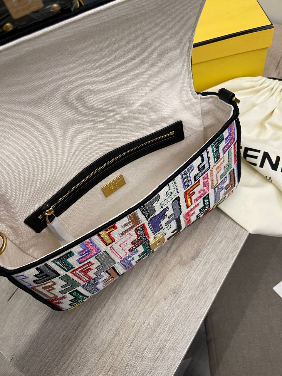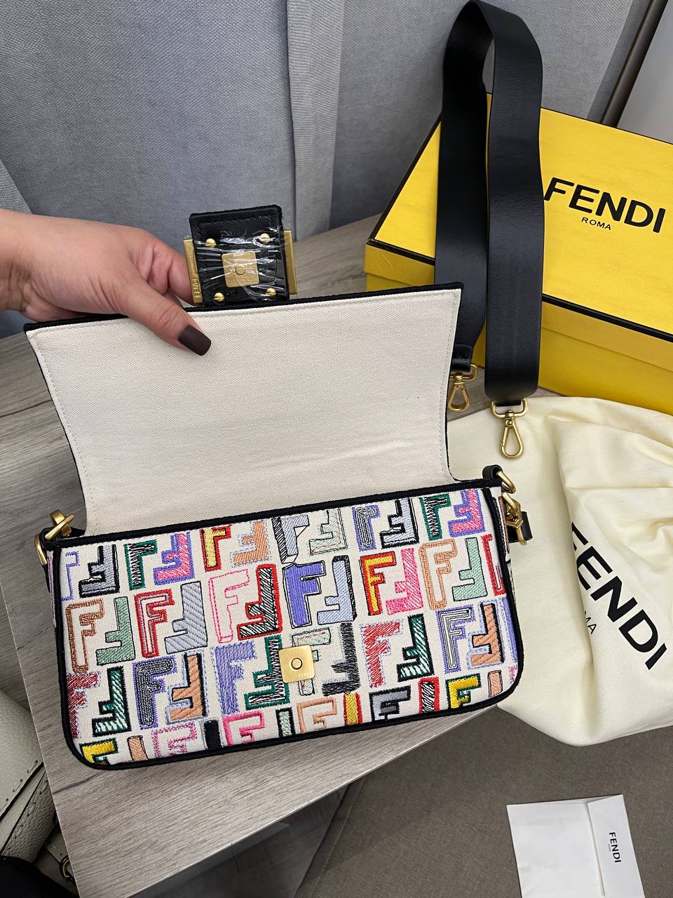 Сумка женская Fendi LUX-97002 представляет собой стильный аксессуар, который подчеркнет индивидуальность. Сумка выполнена в ярком дизайне с разноцветным узором, имеет черный плечевой ремень и золотистую фурнитуру. Идеально подойдет для повседневного использования и особых случаев.
