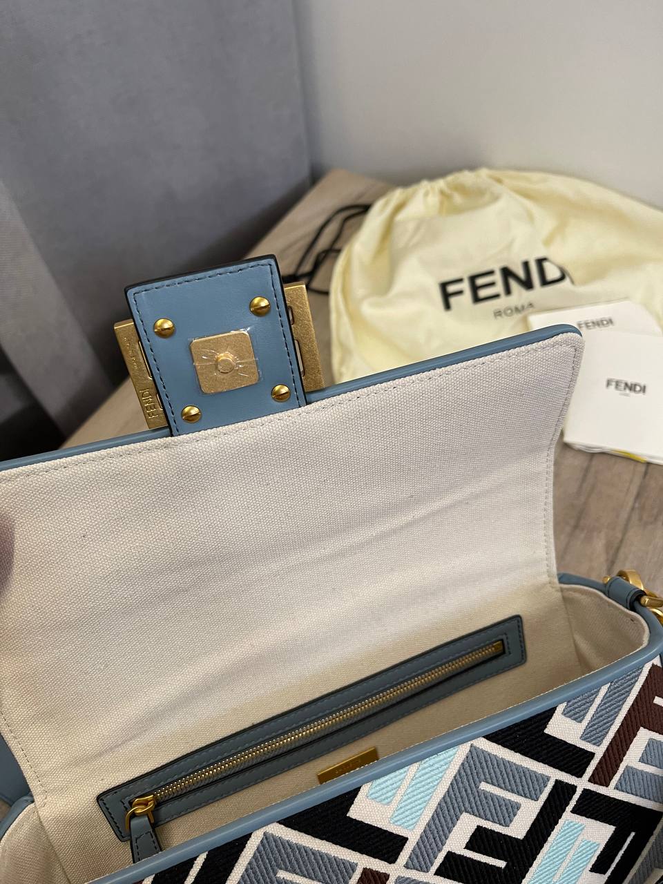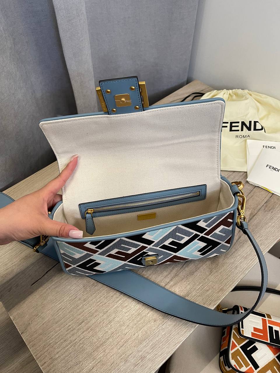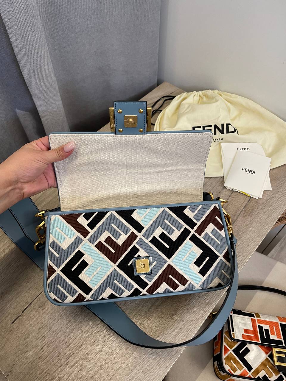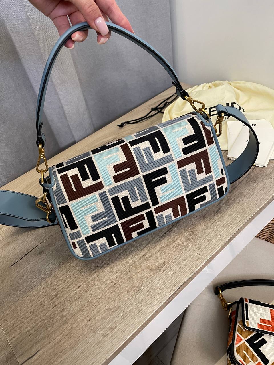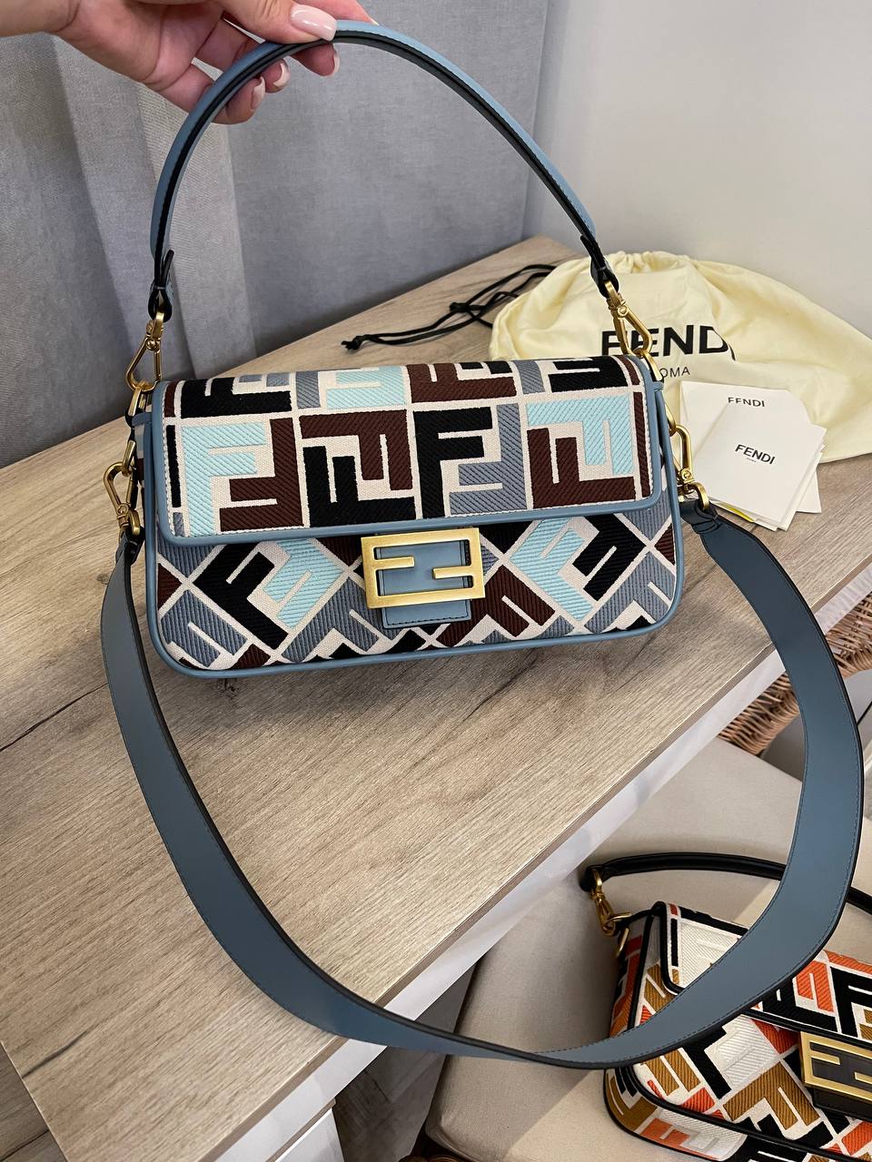 Сумка женская Fendi LUX-107101 - это стильный аксессуар, выполненный в узнаваемом дизайне. Яркий узор с логотипом бренда, сочетающий в себе различные оттенки синего, коричневого и черного цветов, делает сумку заметной и привлекательной. Эта модель идеально подойдет для повседневного использования, добавляя изысканности и индивидуальности вашему образу.