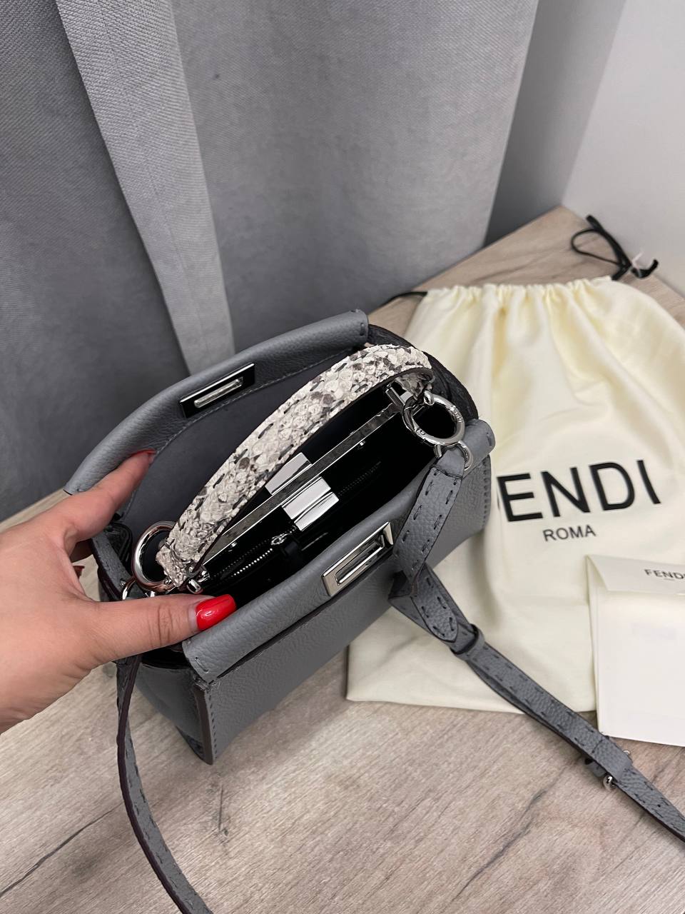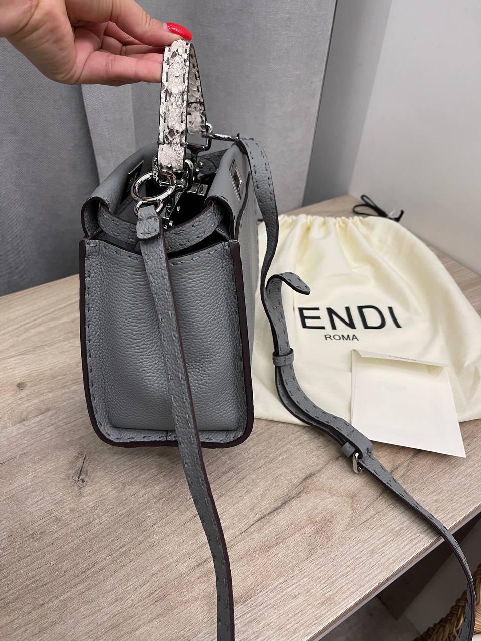 Сумка женская Fendi LUX-103569 - это элегантная сумка через плечо, выполненная в минималистичном стиле. Сумка имеет серо-голубой цвет, что придает ей универсальность и позволяет сочетать с различными образами. Текстура материала выглядит слегка зернистой, добавляя изысканности.