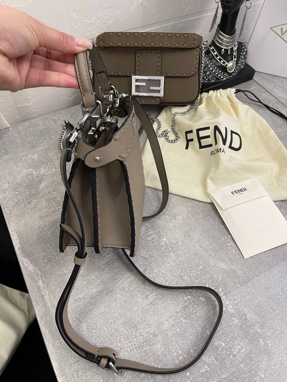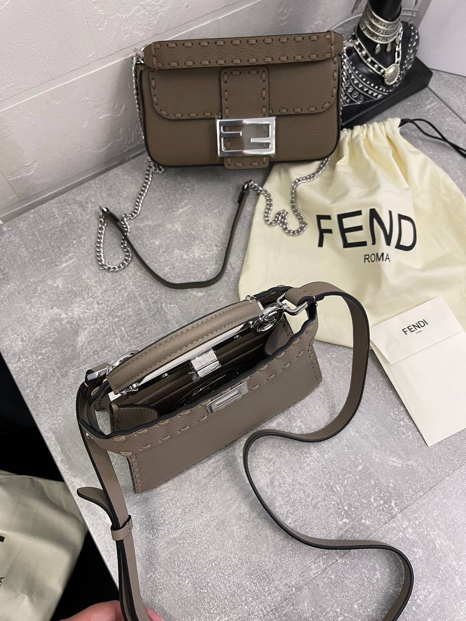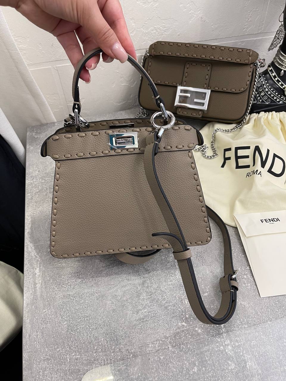 Сумка женская Peekaboo ISeeU Fendi LUX-107972 представляет собой элегантный аксессуар для повседневного использования. Сумка выполнена в нежном сером цвете, что подчеркивает ее изысканный стиль. Ее текстура, вероятно, кожаная, придает изделию роскошный вид.