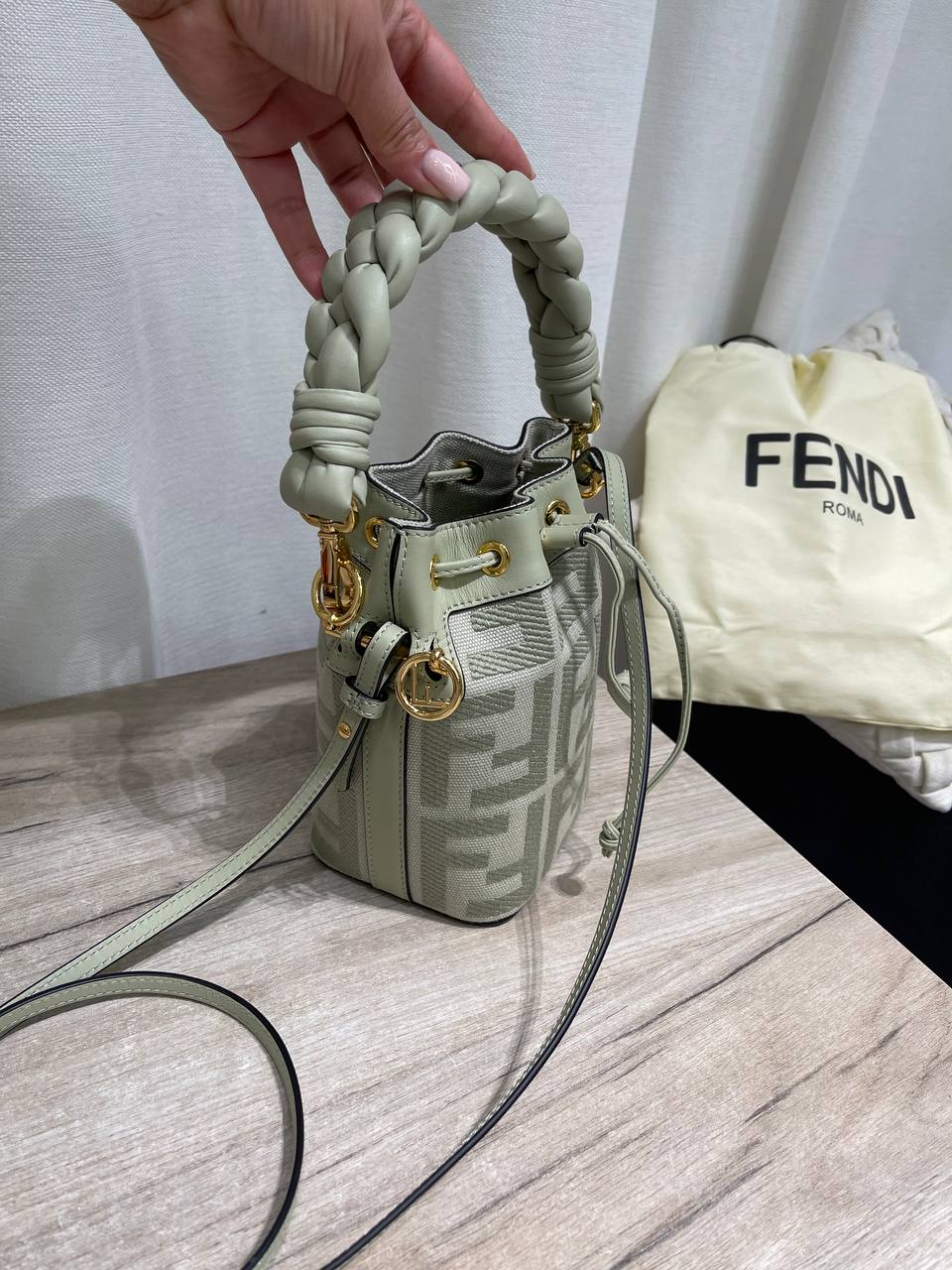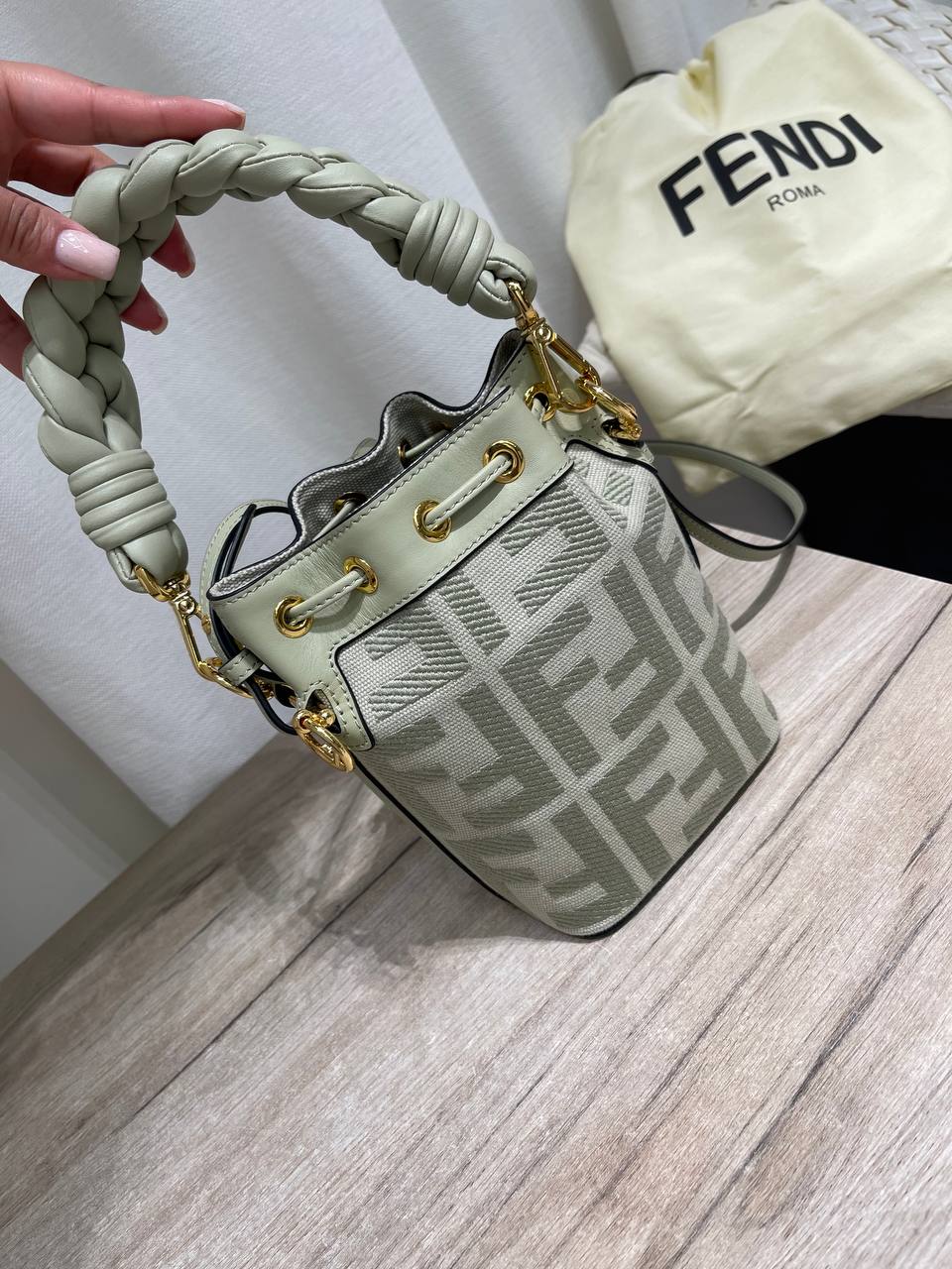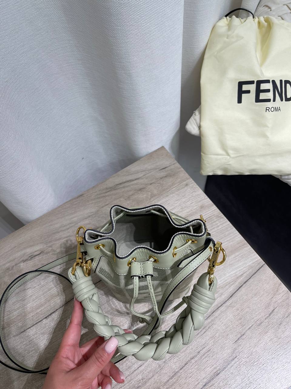 Сумка женская Fendi LUX-119857 — стильный аксессуар в светло-зеленом оттенке. Сумка выполнена в форме ведра, украшена плетеными ручками и съемным ремешком через плечо. Эта модель подойдет для повседневного использования и станет прекрасным дополнением к вашему образу.