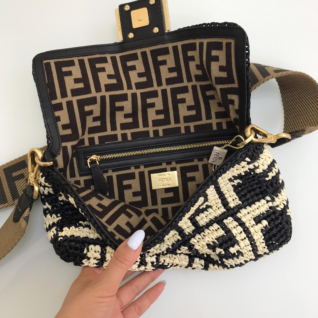 Стильная женская сумка Fendi LUX-13728 выполнена в узнаваемом дизайне бренда, сочетая классический монограммный принт с оригинальной плетеной фактурой. Эта модель идеально подойдет для создания эффектных образов в стиле casual и элегантного кэжуал, добавляя нотку роскоши в повседневный гардероб.