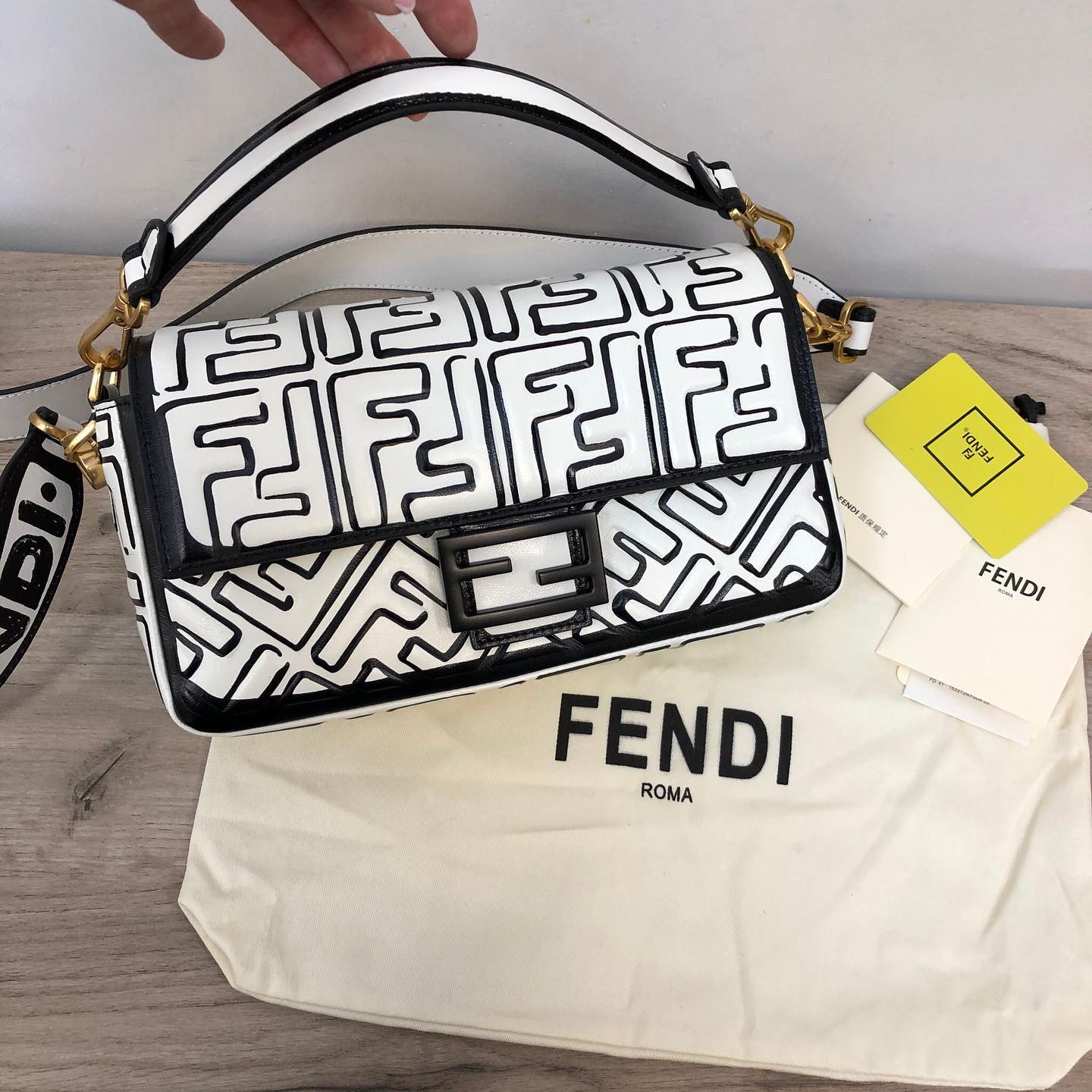 Сумка женская Fendi Baguette LUX-34984 – это стильный аксессуар, который подчеркнет вашу индивидуальность. Данная модель выполнена в классическом форм-факторе Baguette, который узнаваем во всем мире. Оригинальный черно-белый принт FF Monogram придает сумке современный и эффектный вид, делая ее заметной деталью любого образа. Сумка Fendi Baguette LUX-34984 идеально подойдет для повседневного использования, добавив шика и элегантности.