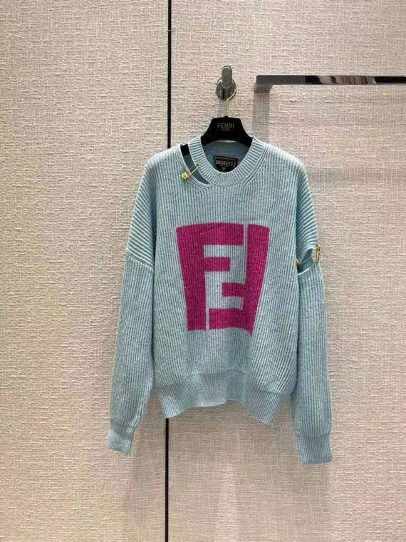 Свитер Fendi LUX-71988 — это стильный предмет гардероба от известного бренда. Он выполнен в небесно-голубом цвете с крупным логотипом бренда ярко-розового цвета. Этот свитер идеально подходит для создания модных и комфортных образов.
