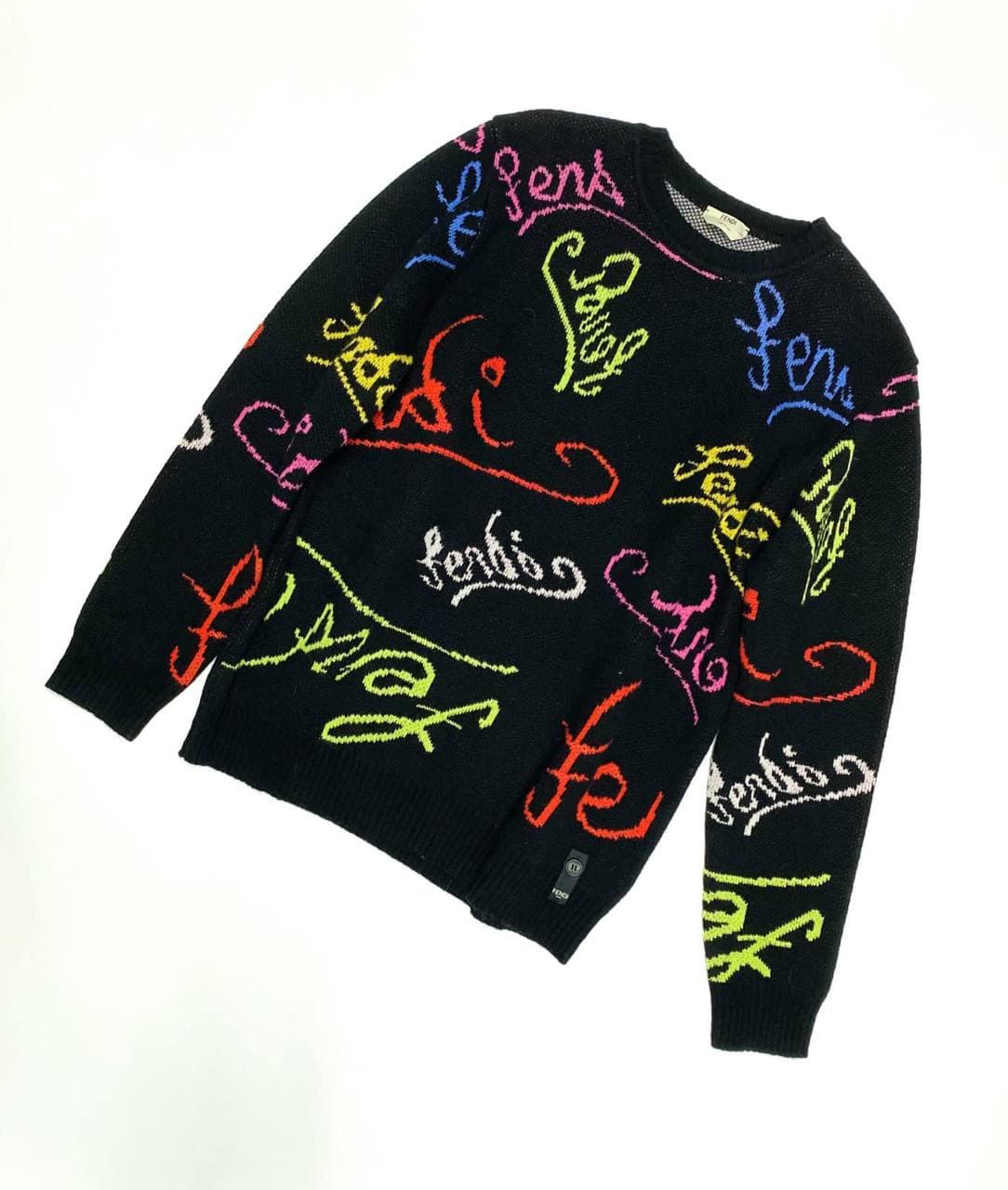 Свитер Fendi LUX-62047 — это стильный трикотажный свитер с ярким принтом, который добавит акцент в любой образ. Модель выполнена в черном цвете и украшена разноцветными надписями бренда Fendi, создавая динамичный и модный вид. Отлично подойдет для создания повседневных и эффектных луков.