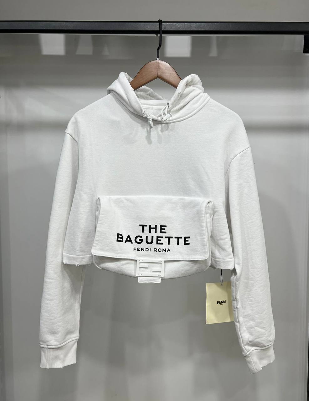 Толстовка женская Fendi LUX-94815 — это стильный предмет гардероба от известного бренда. Эта толстовка выполнена в белом цвете и имеет современный дизайн с акцентом на надпись "THE BAGUETTE FENDI ROMA" на передней части. Идеально подходит для создания повседневных и модных образов.
