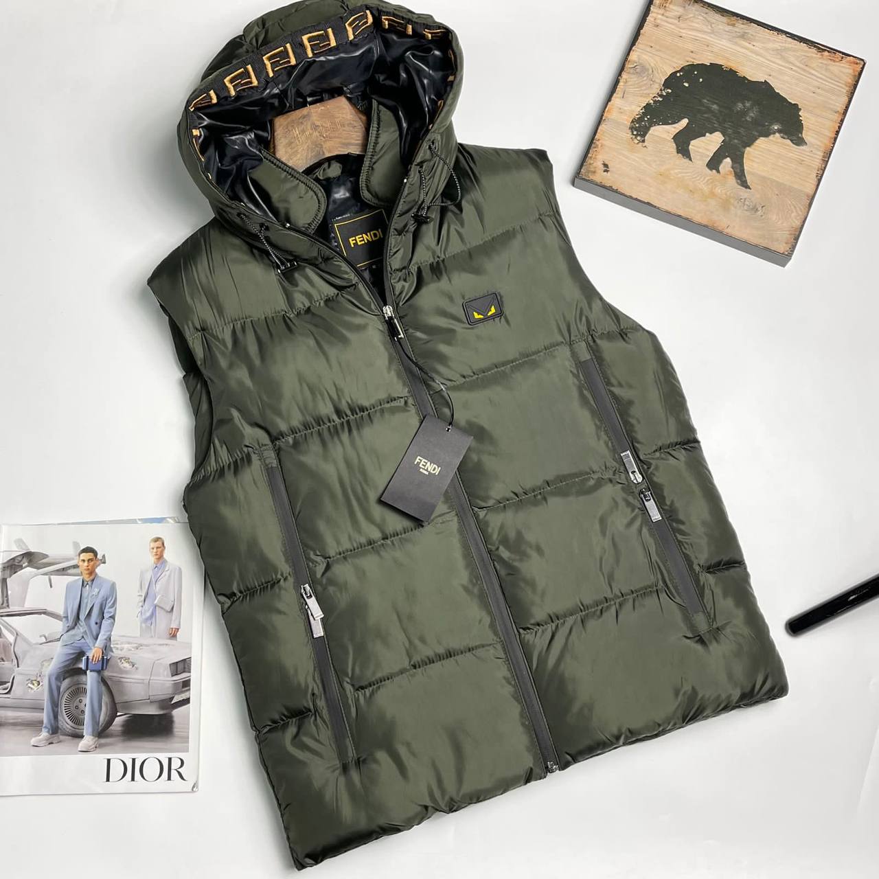 Жилет Fendi LUX-76639 – это стильный и современный жилет, выполненный в темно-зеленом цвете. Имеет стеганую текстуру, капюшон и молнию. Подходит для повседневной носки, создавая комфорт и тепло в прохладную погоду.