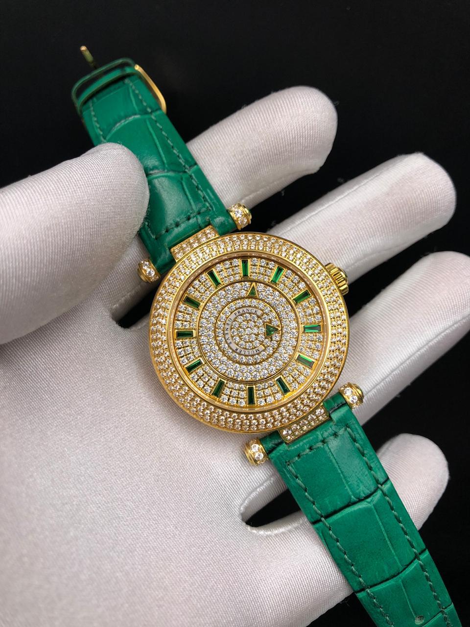 Представляем женские часы Franck Muller LUX-21411 — роскошный аксессуар, сочетающий в себе элегантность и роскошь. Эти часы, выполненные в классическом круглом корпусе, украшены сверкающими кристаллами и изумрудными акцентами, что придает им изысканный вид. Зеленый ремешок из крокодиловой кожи добавляет образу завершенности и стиля.