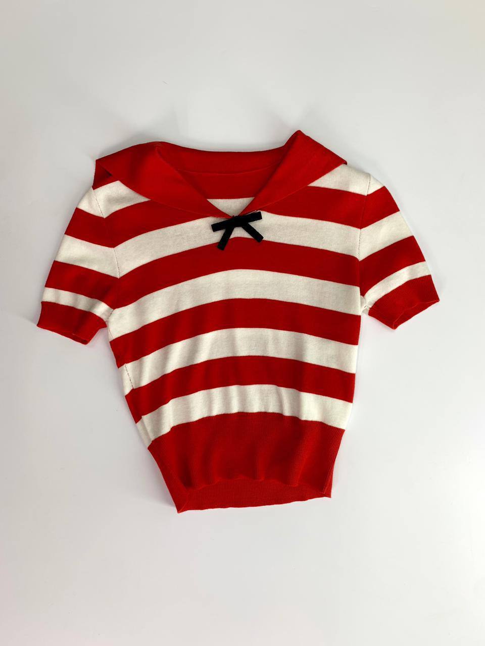 Футболка LUX-52706 от бренда LUXE-CRIME представляет собой стильный элемент гардероба, выполненный в морском стиле. Ее характерные красные и белые горизонтальные полосы, широкий отложной воротник и элегантный черный бант у горловины придают образу особую изюминку. Модель идеально подойдет для создания непринужденных, но элегантных летних образов.