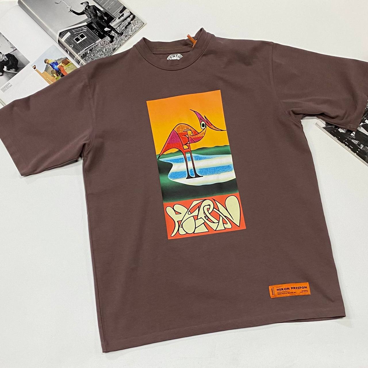 Футболка LUX-72006 от бренда Heron Preston выполнена в современном стиле. Футболка коричневого цвета с ярким графическим принтом, который придает ей оригинальность. Идеально подойдет для создания повседневных образов.