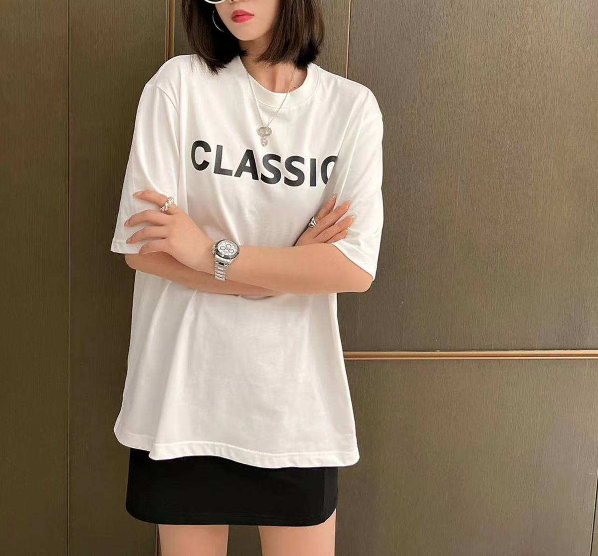 Футболка LUX-86323, представленная на изображении, — это стильная футболка белого цвета с крупным черным принтом "CLASSIC". Футболка имеет прямой крой с короткими рукавами, что делает ее универсальной для различных образов. Такая футболка подойдет для повседневной носки, сочетаясь как с юбками, так и с брюками или джинсами.