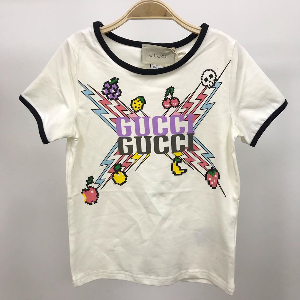 Футболка Gucci LUX-30253 - это яркий и стильный предмет одежды, который идеально подойдет для создания эффектных образов. Футболка выполнена в современном дизайне с оригинальным принтом, сочетающим логотип бренда Gucci и пиксельные изображения фруктов и черепа.