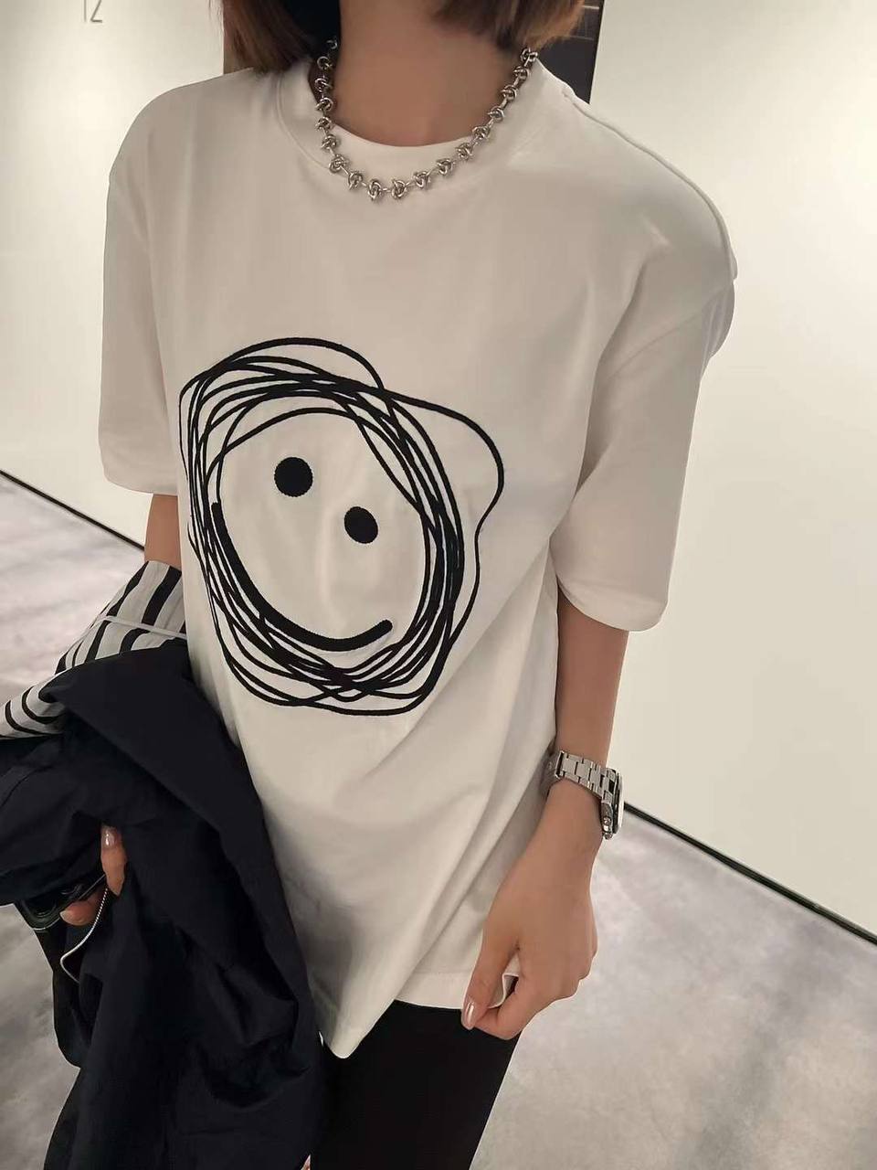 Футболка LUX-89953 — это белая футболка с короткими рукавами и круглым вырезом. Футболка украшена абстрактным принтом в виде смайлика. Предназначена для повседневного ношения.