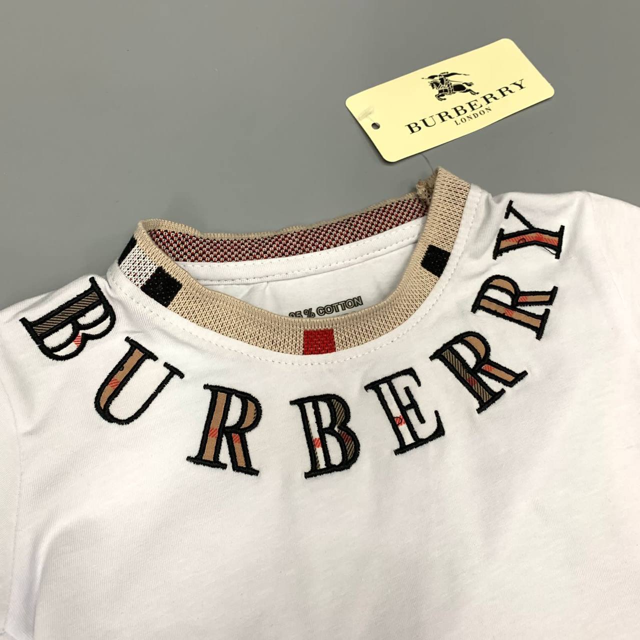 Футболка Burberry LUX-91897 представляет собой стильный предмет гардероба для детей. Белая футболка с круглым вырезом горловины, декорированным фирменным узором бренда. Дизайн футболки подчеркивает логотип бренда, который расположен по окружности ворота.