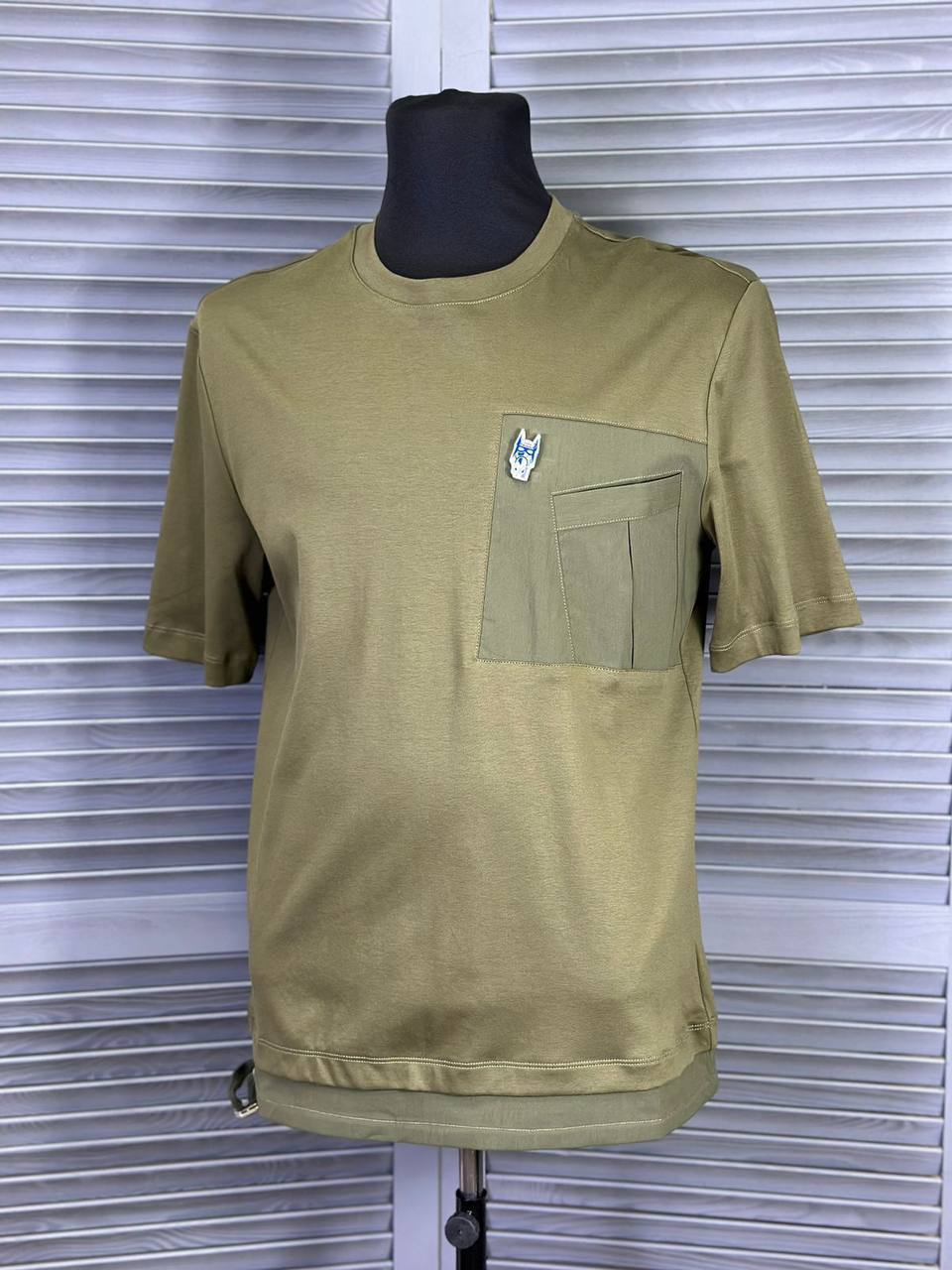 Футболка LUX-92124 — это современный предмет гардероба. Футболка выполнена в повседневном стиле, имеет оливковый цвет и минималистичный дизайн с накладным карманом и декоративной брошью. Этот предмет одежды подойдет для создания различных образов, от повседневных до более формальных.