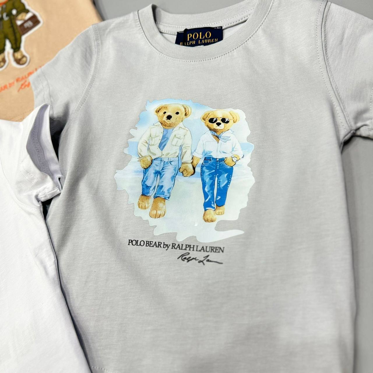 Футболка POLO BEAR by RALPH LAUREN, представленная на изображении, - это стильный предмет гардероба. Футболка серого цвета, с круглым вырезом и короткими рукавами. На ней изображен принт с медведями.