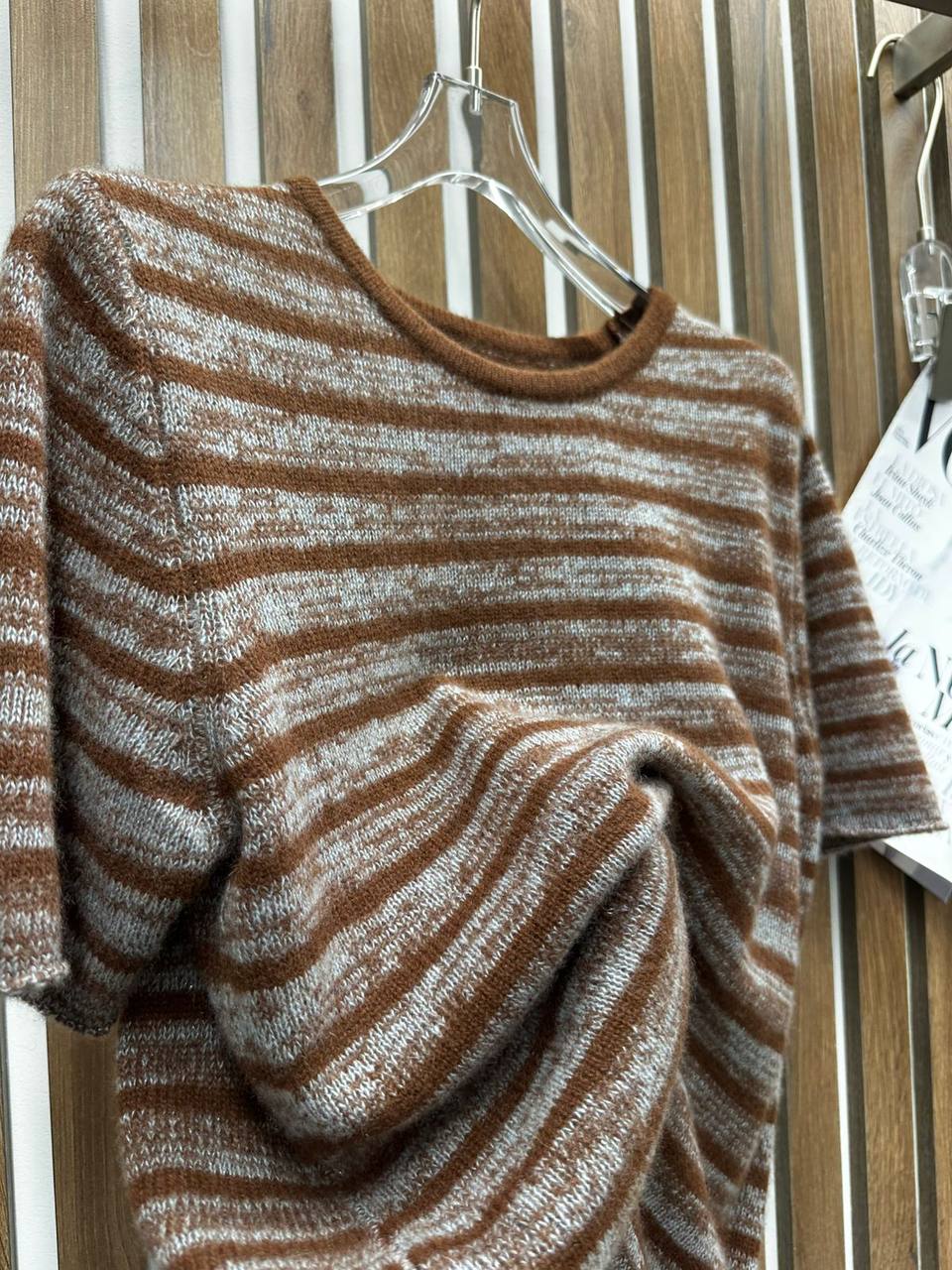 Футболка LUX-125963 с короткими рукавами в полоску – стильный и комфортный выбор для повседневного гардероба. Приятный коричневый оттенок в сочетании с серыми полосками создаёт лаконичный и универсальный образ.