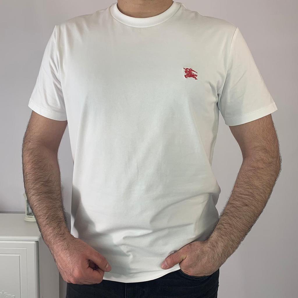 Футболка LUX-46852 от Burberry — это классическая белая футболка с круглым вырезом и короткими рукавами. На груди расположен небольшой вышитый логотип бренда в красном цвете, придающий изделию элегантность и узнаваемость. Эта футболка идеально подходит для повседневного ношения, легко сочетается с джинсами, шортами или брюками, создавая стильные и комфортные образы.