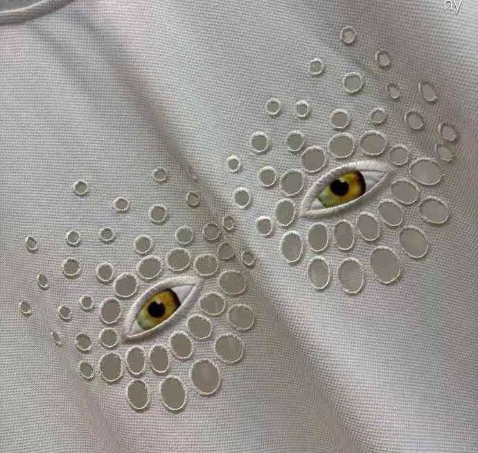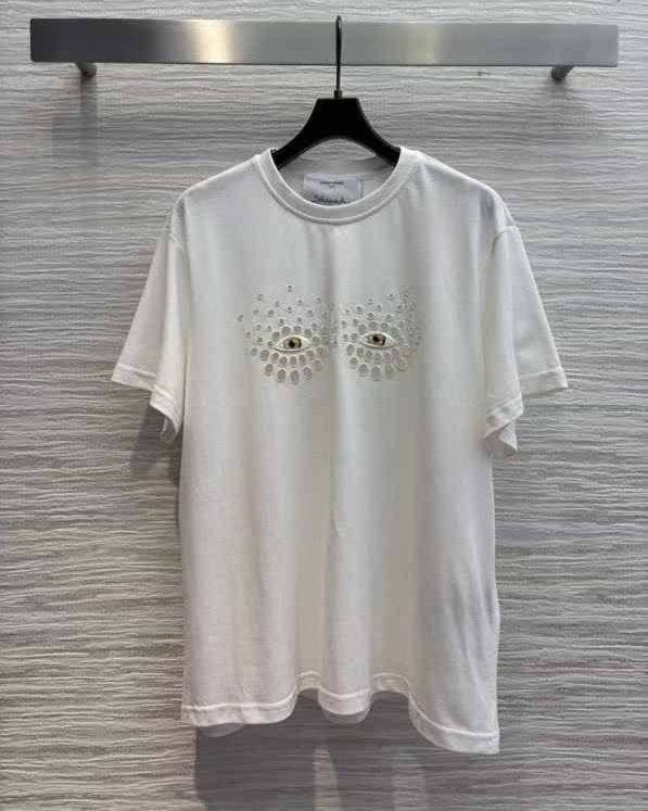 Футболка Schiaparelli LUX-119763 — это стильный предмет гардероба, представляющий собой футболку белого цвета с круглым вырезом. Ее дизайн украшен оригинальным принтом в виде глаз, выполненным с использованием декоративных элементов. Футболка идеально подходит для создания модных и запоминающихся образов.
