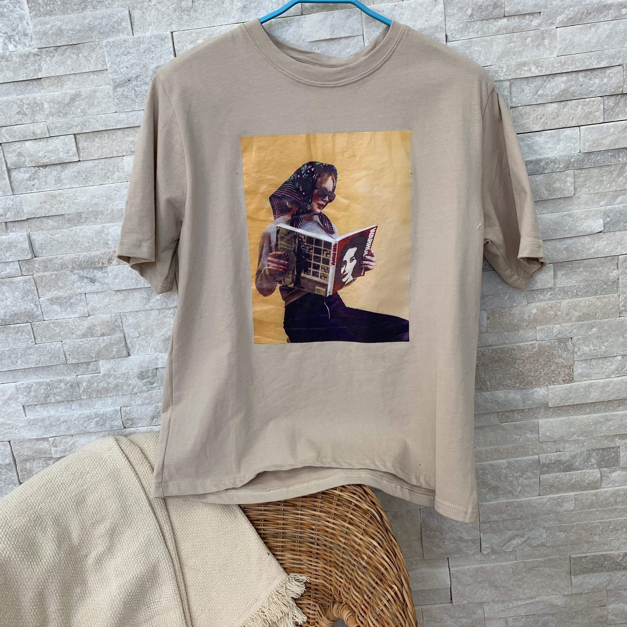 Эта женская футболка от LUX-CRIME отличается оригинальным принтом, изображающим стильную девушку, читающую журнал. Модель выполнена в спокойном бежевом цвете, что делает ее универсальной и легко сочетаемой с любым гардеробом. Футболка станет отличным выбором для создания расслабленных, но в то же время модных образов на каждый день.