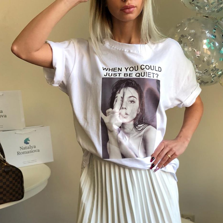 Футболка женская LUX-10783 от бренда LUXE CRIME — это стильный элемент гардероба, выполненный в трендовом повседневном стиле. Ее дизайн подчеркивается оригинальным принтом с изображением девушки и надписью "WHEN YOU COULD JUST BE QUIET?", что добавляет образу нотку дерзости и индивидуальности.