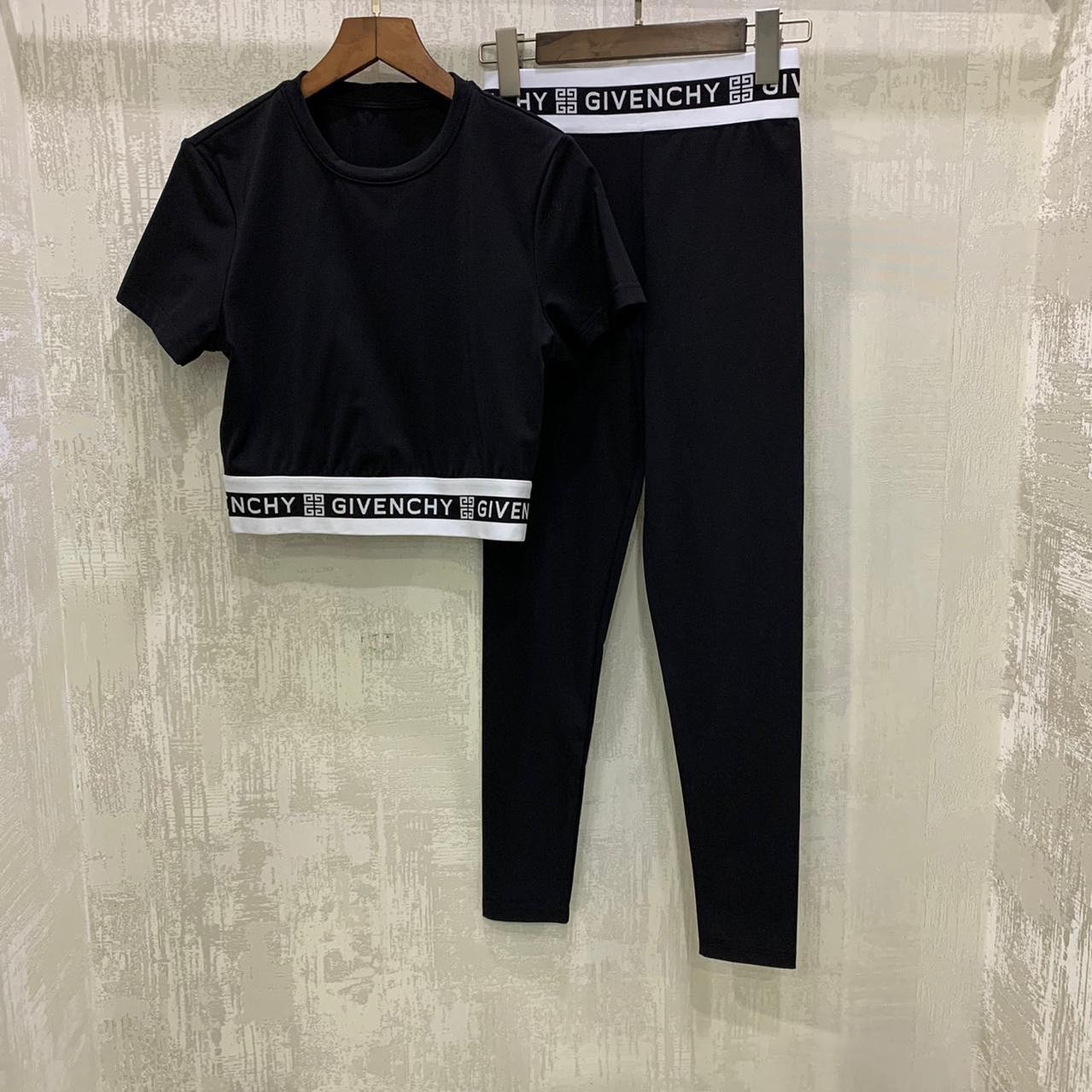 Стильный спортивный костюм Givenchy LUX-46081 — идеальный выбор для современных женщин, ценящих комфорт и элегантность. Комплект состоит из кроп-топа с короткими рукавами и облегающих леггинсов, украшенных контрастной фирменной лентой с логотипом. Черный цвет придает образу лаконичность, а спортивный крой обеспечивает максимальную свободу движений. Этот костюм отлично подойдет как для занятий спортом, так и для создания расслабленных повседневных образов.