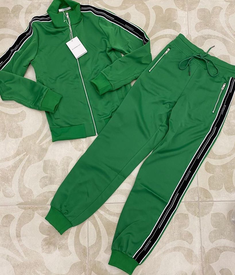 Представляем спортивный костюм Givenchy LUX-30035. Этот стильный комплект, выполненный в ярком зеленом цвете, идеально подходит для создания модного спортивного образа. Дизайн костюма украшен фирменными полосами с логотипом бренда, что придает ему узнаваемый вид.