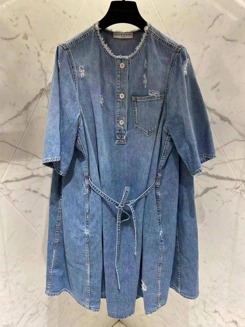 Платье Givenchy LUX-49209 выполнено из денима в голубом цвете, демонстрируя стиль кэжуал с элементами гранжа. Оно имеет полуприлегающий силуэт, короткие рукава и круглый вырез горловины, дополненное поясом на талии, который подчеркивает фигуру. Декоративные потертости и необработанный край добавляют образу небрежной элегантности, делая его выразительным и стильным.