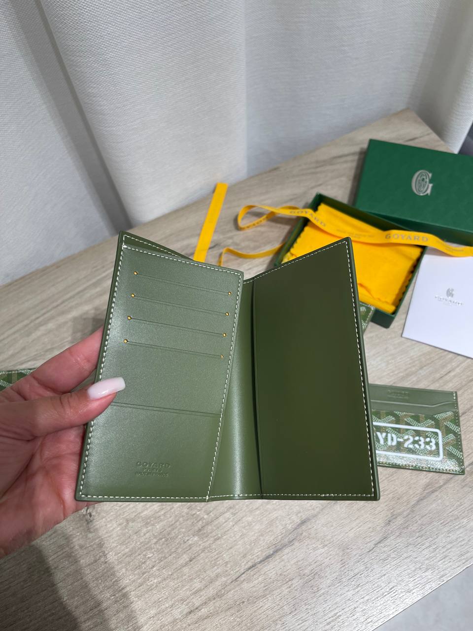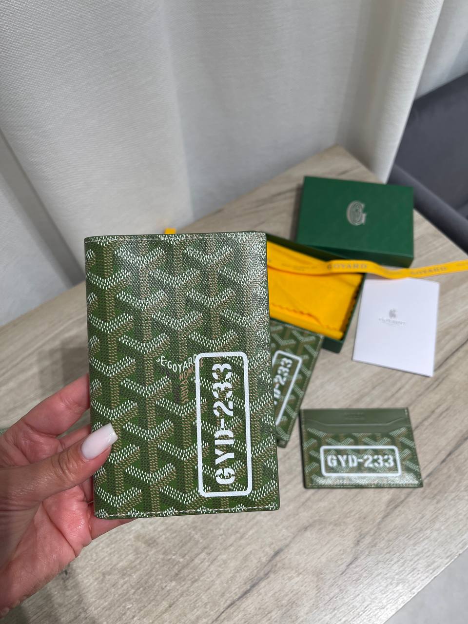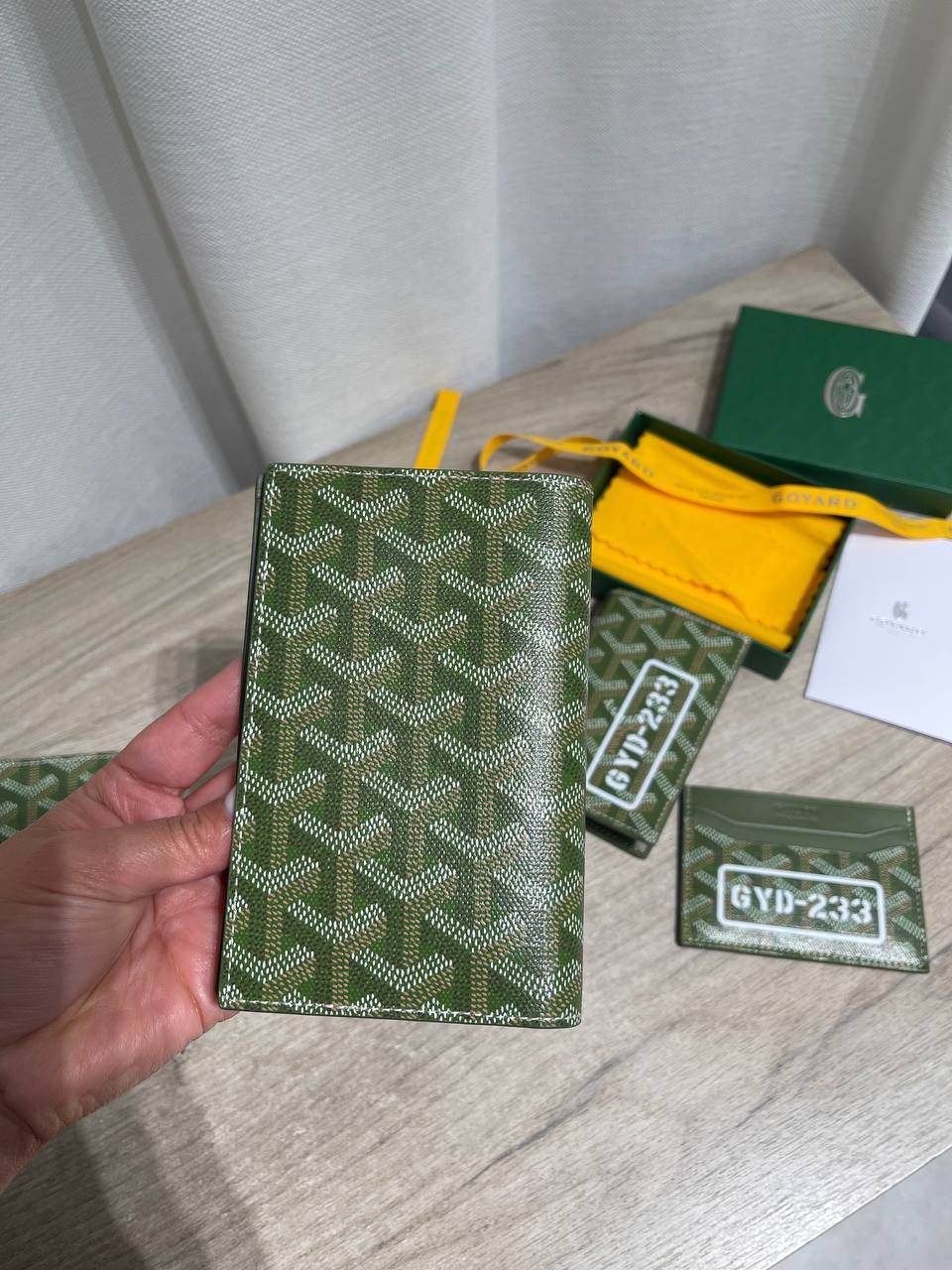 Представлена стильная обложка на паспорт от Goyard, сочетающая в себе элегантность и практичность. Аксессуар выполнен в фирменном стиле бренда.